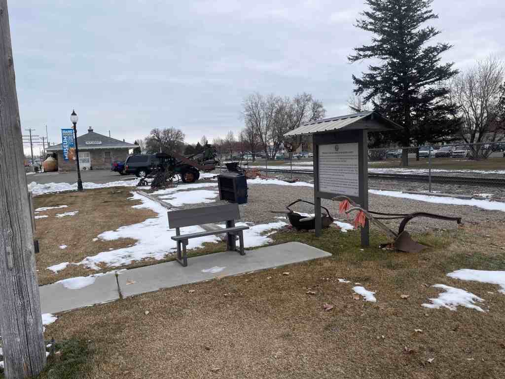 Sons of Utah Pioneers historic marker #282, erected by the Grove City Chapterof Sons of Utah Pioneers at 130 NW Main, Blackfoot, Idaho.