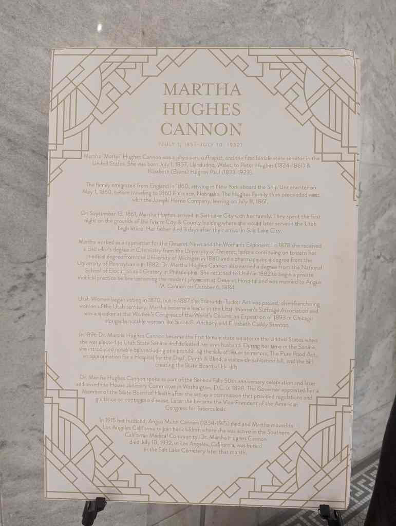 In 1896 Dr. Martha Hughes Cannon became the first female state senator in the United States when she was elected to Utah State Senate and defeated her own husband. During her time in the Senate, she introduced notable bills including one prohibiting the sale of liquor to minors, The Pure Food Act, an appropriation for a Hospital for the Deaf, Dumb & Blind, a statewide sanitation bill, and the bill
