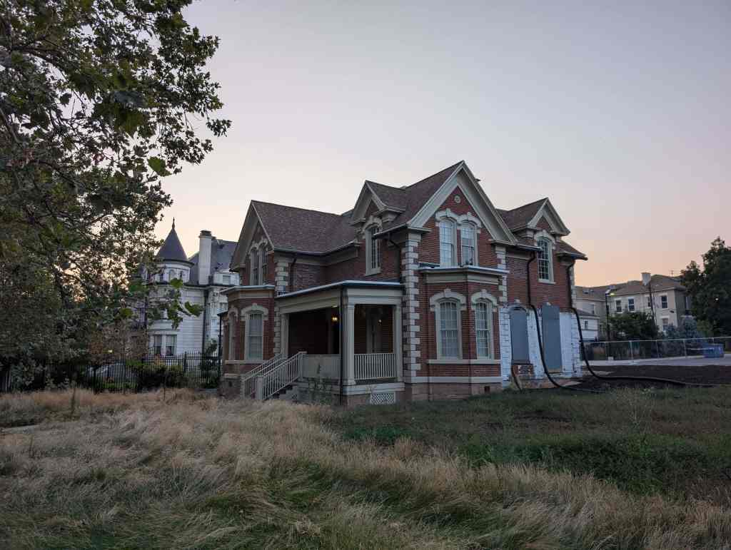 The Epley/Glendinning House resists being pinned down to one style of architecture. Its tall windows capped by hoods, quoins, and projecting bay give it an Italianate flavor. Yet the massing, steeply pitched roof, and dormer window are not typical of the Italianate style.
