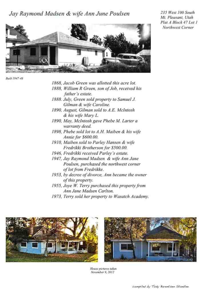 Formerly the site of the home of Jay Raymond Madsen and wife Ann June Poulsen, the timeline below is borrowed from this page: