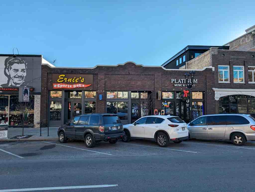 The front of the building was section for three retail stores the façade rhythmically indicating this with 3 off-center entrances flanked by display windows. The ways have been filled in.