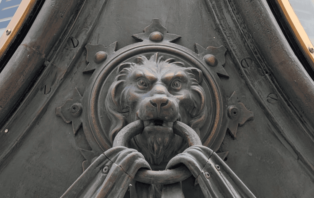 From the location where I took the above photo, Look under the bridge, Find the center letter of the 7 between giant insects, Find the nearby sign that has that letter twice, 3rd on each line