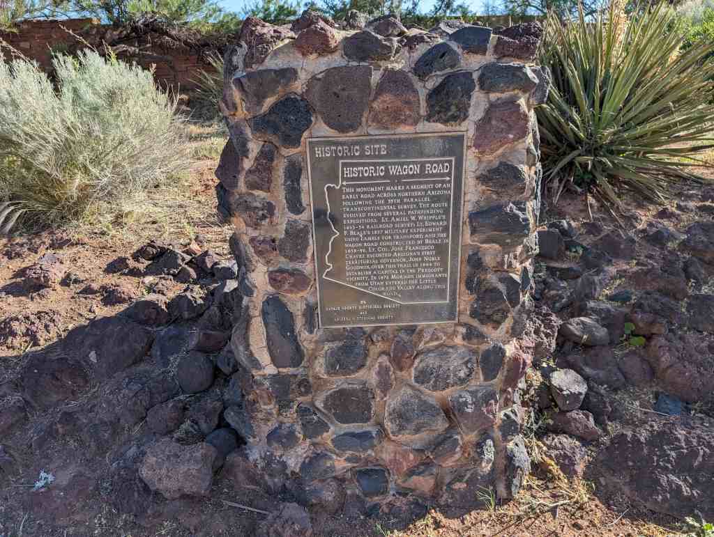This monument marks a segment of an early road across northern Arizona following the 35th parallel-transcontinental survey. The route evolved from several pathfinding expeditions: Lt. Amiel W. Whipple’s 1853-54 railroad survey; Lt. Edward F. Beale’s 1857 military experiment using camels for transport; and the wagon road constructed by Beale in 1858-59. Lt. Col. Jose Francisco Chavez escorted Arizona’s first territorial governor, John Noble Goodwin, over this trail in 1864 to establish a capital in the Prescott vicinity. In 1876 Mormon immigrants from Utah entered the Little Colorado Valley along this road.
