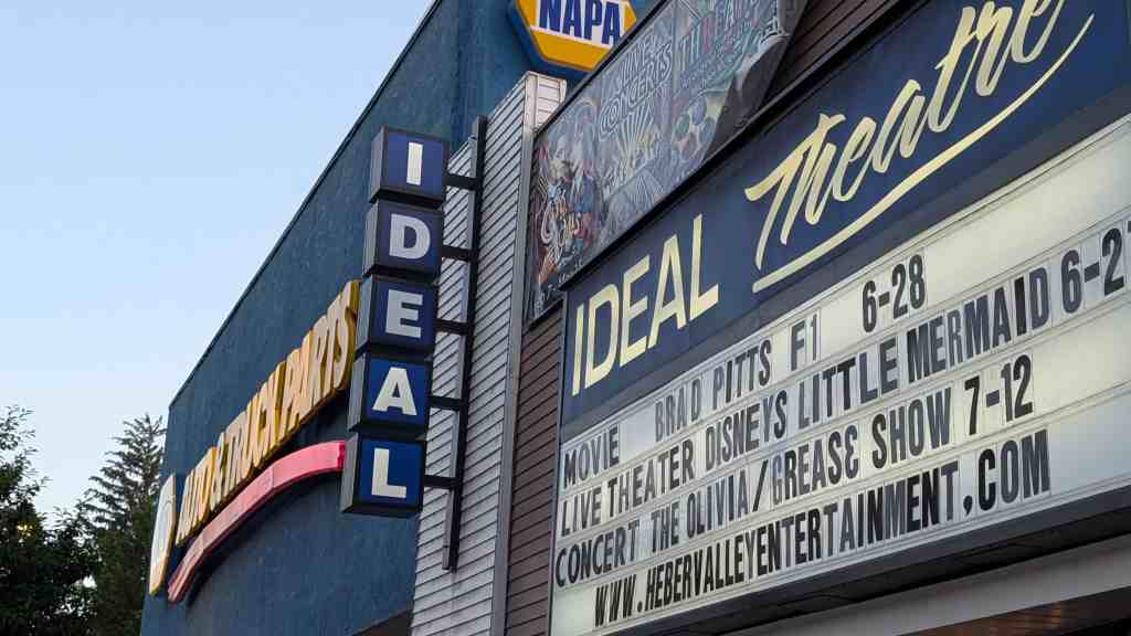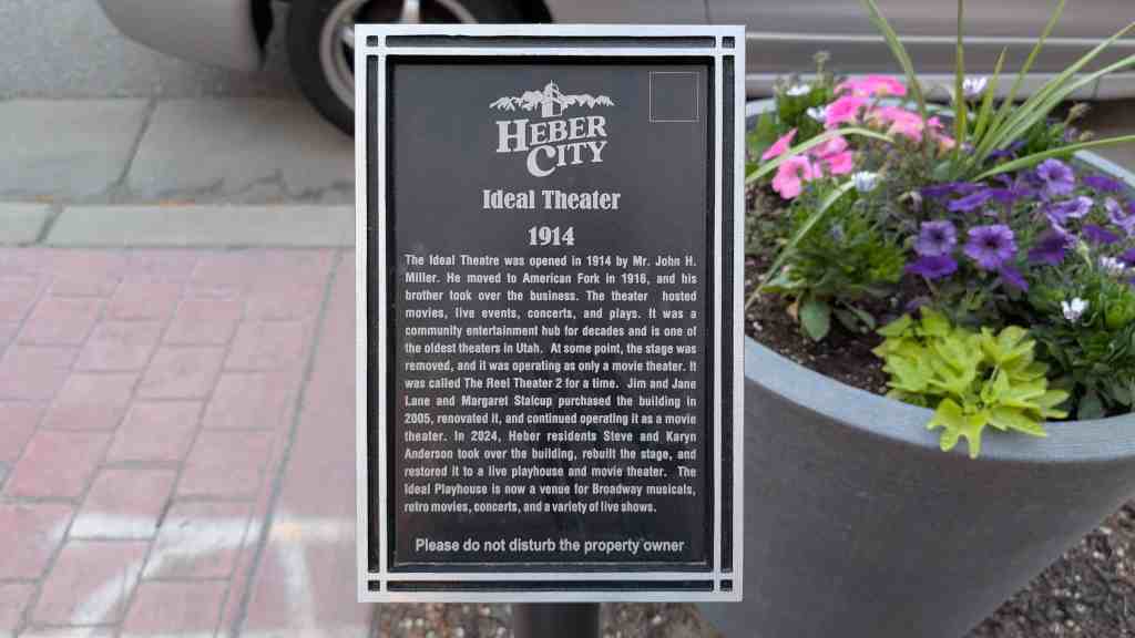 The Ideal Theatre was opened in 1914 by Mr. John H. Miller. He moved to American Fork in 1916, and his brother took over the business. The theater hosted movies, live events, concerts, and plays. It was a community entertainment hub for decades and is one of the oldest theaters in Utah. At some point, the stage was removed, and it was operating as only a movie theater. It was called The Reel Theater 2 for a time. Jim and Jane Lane and Margaret Stalcup purchased the building in 2005, renovated it, and continued operating it as a movie theater. In 2024, Heber residents Steve and Karyn Anderson took over the building, rebuilt the stage, and restored it to a live playhouse and movie theater. The Ideal Playhouse is now a venue for Broadway musicals, retro movies, concerts, and a variety of live shows.