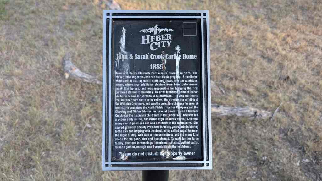 John and Sarah Elizabeth Carlile were marri in 1878, and moved into a log cabin John had built on the property. Six children were born in that log cabin, until they moved into the sandstone home, where four additional children were born. John owned many fine horses, and was responsible for bringing the first purebred stallion to the valley. He often furnished teams of four or six-horse teams for parades or celebrations. He was the first to register shorthorn cattle in the valley. He directed the building of the Wasatch Creamery, and was the constable of peace for several terms. He organized the North Fields Irrigation Company and the Director and Water Master for several years. Sarah Elizabeth Crook was the first white child born in the Weber For. She was left a widow early in life, and raised eight children alone. She held many church positions and was a midwife in the community. She served as Relief Society President for many years, administering to the sick and helping with the dead, being called out all hours of the night or day. She was a fine seamstress and did many kind deeds for the poor, sick and homebound. To ca for her large family, she took in washings, laundered curtains, quilted quilts, raised a garden, enough to sell vegetables to the neighbors.