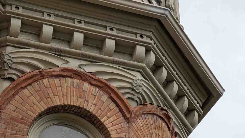 The prominent feature of the home is its bell-shaped dome, a signature of the Queen Anne style, as are the decorative woodwork in the small gable above the dormer and above the second-story windows in the turret and the stained glass in the first-floor windows. But the arched windows derive from the Romanesque style – popular for public buildings (e.g. the City and County Building) but less common in residential design. The heavy lintels above the windows on the first floor emphasize the massiveness typical of Romanesque architecture. Note the original two-story carriage house at the end of the driveway.