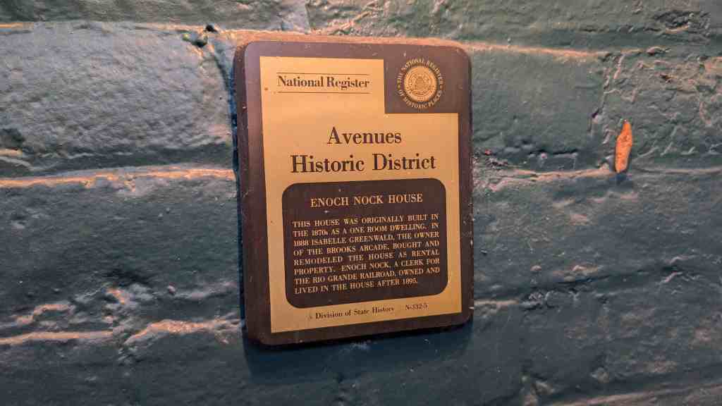 This house was originally built in the 1870s as a one room dwelling. In 1888 Isabelle Greenwalk, the owner of the Brooks Arcade, bought and remodeled the house as rental property. Enoch Nock, a clerk for the Rio Grande Railroad, owned and lived in the house after 1895.