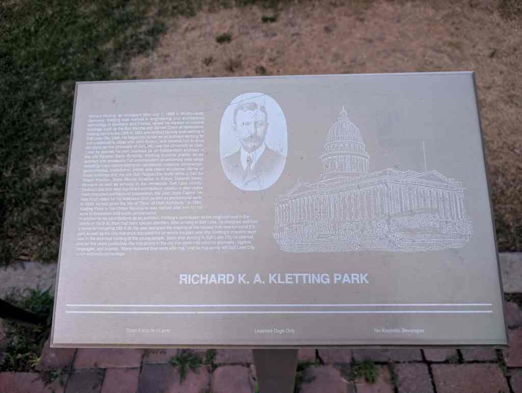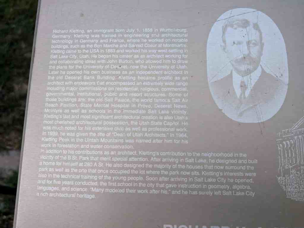 In addition to his contributions as an architect, Kletting’s contribution to the neighborhood in the vicinity of the B St. Park that merit special attention. After arriving in Salt Lake, he designed and built a home for himself at 280 A St. He also designed the majority of the houses that now surround the park as well as the one that once occupied the lot where the park now sits. Kletting’s interests were also in the technical training of the young people. Soon after arriving in Salt Lake City he opened, and for five years conducted, the first school in the city that gave instruction in geometry, algebra, languages, and science. “Many modeled their work after his,” and he has surely left Salt Lake City a rich architectural heritage.