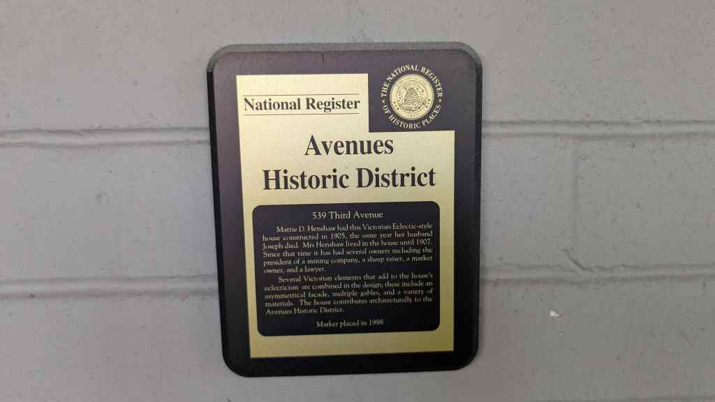 Mattie D. Henshaw had this Victorian Eclectic-style house constructed in 1905, the same year her husband Joseph died. Mrs Henshaw lived in the house until 1907. Since that time it has had several owners including the president of a mining company, a sheep raiser, a market owner, and a lawyer.