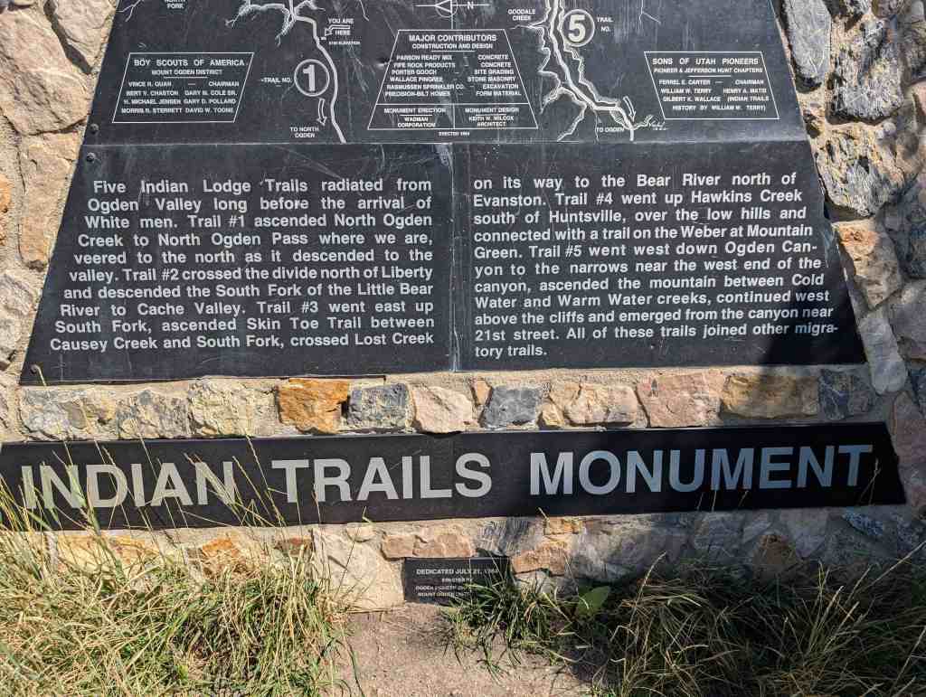 Five Indian Lodge Trails radiated Ogden Valley long before the arrival of White men. Trail #1 ascended North Ogden Creek to North Ogden Pass where we are, veered to the north as it descended to the valley. Trail #2 crossed the divide north of Liberty and descended the South Fork of the Little Bear River to Cache Valley. Trail #3 went east up South Fork, ascended Skin Toe Trail between Causey Creek and South Fork, crossed Lost Creek on its way to the Bear River north of Evanston. Trail #4 went up Hawkins Creek south of Huntsville, over the low hills and connected with a trail on the Weber at Mountain Green. Trail #5 went west down Ogden Canyon to the narrows near the west end of the canyon, ascended the mountain between Cold Water and Warm Water creeks, continued west above the cliffs and emerged from the canyon near 21st street. All of these trails joined other migratory trails.