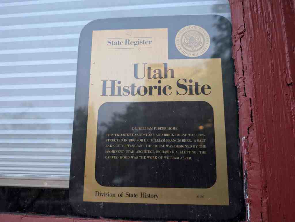 This two-story sandstone and brick house was constructed in 1899 for Dr. William Francis Beer, a Salt Lake City physician. The house was designed by the prominent Utah architect Richard K.A. Kletting. The carved wood was the work of William Asper.