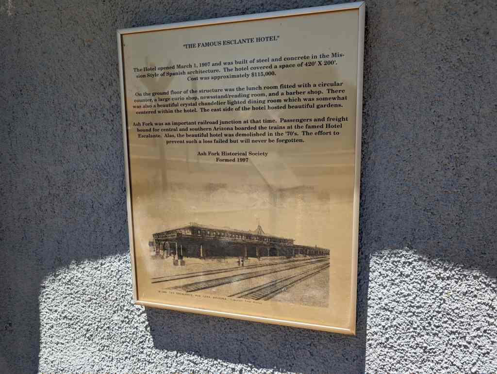 Ash Fork was an important railroad junction at that time. Passengers and freight bound for central and southern Arizona boarded the trains at the famed Hotel Escalante. Alas, the beautiful hotel was demolished in the ’70’s. The effort to prevent such a loss failed but will never be forgotten.