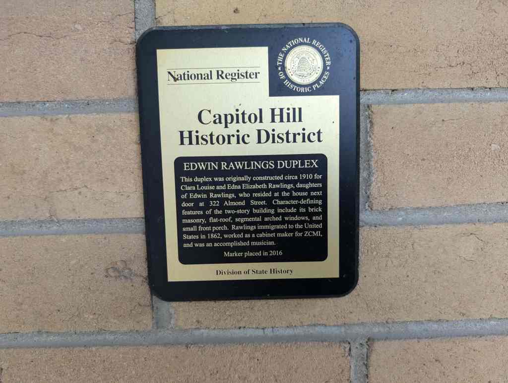 This duplex was originally constructed circa 1910 for Clara Louise and Edna Elizabeth Rawlings, daughters of Edwin Rawlings, who resided at the house next door at 322 Almond Street. Character-defining features of the two-story building include its brick masonry, flat-roof, segmental arched windows, and small front porch. Rawlings immigrated to the United States in 1862, worked as a cabinet maker for ZCMI, and was an accomplished musician.