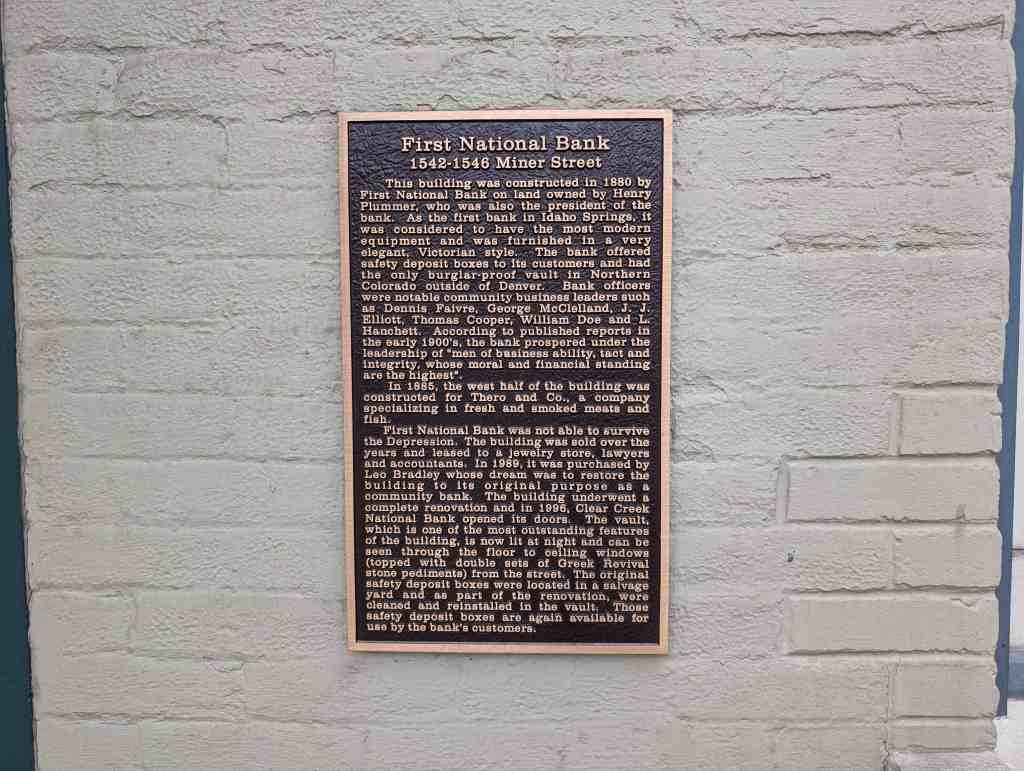 This building was constructed in 1880 by First National Bank on land owned by Henry Plummer, who was also the president of the bank. As the first bank in Idaho Springs, it was considered to have the most modern equipment and was furnished in a very elegant, Victorian style. The bank offered safety deposit boxes to its customers and had the only burglar-proof vault in Northern Colorado outside of Denver. Bank officers were notable community business leaders such as Dennis Faivre, George McClelland, J. J. Elliott, Thomas Cooper, William Doe and L. Hanchett. According to published reports in the early 1900’s, the bank prospered under the leadership of “men of business ability, tact and integrity, whose moral and financial standing are the highest”.