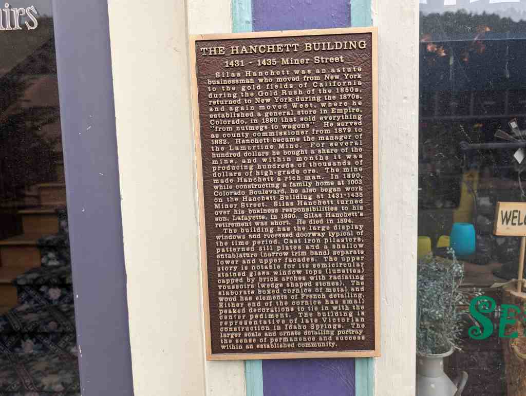 Silas Hanchett was an astute businessman who moved from New York to the gold fields of California during the Gold Rush of the 1850s, returned to New York during the 1870s, and again moved West, where he established a general store in Empire, Colorado, in 1880 that sold everything “from nutmegs to wagons”. He served as county commissioner from 1879 to 1882. Hanchett became the manager of the Lamartine Mine. For several hundred dollars he bought a share of the mine, and within months it was producing hundreds of thousands of The mine dollars of high-grade ore made Hanchett a rich man. In 1890, while constructing a family home at 1003 Colorado Boulevard, he also began work on the Hanchett Building at 1431-1435 Miner Street. Silas Hanchett turned over his business responsibilities to his son, Lafayette, in 1890. Silas Hanchett’s retirement was short. He died in 1894.