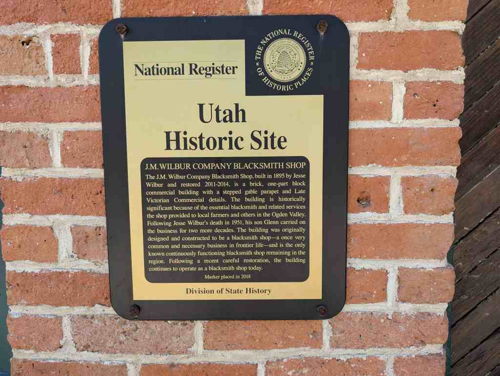 The J.M. Wilbur Company Blacksmith Shop, built in 1895 by Jesse Wilbur and restored 2011-2014, is a brick, one-part block commercial building with a stepped gable parapet and Late Victorian Commercial details. The building is historically significant because of the essential blacksmith and related services the shop provided to local farmers and others in the Ogden Valley. Following Jesse Wilbur’s death in 1951, his son Glenn carried on the business for two more decades. The building was originally designed and constructed to be a blacksmith shop – a once very common and necessary business in frontier life – and is the only known continuously functioning blacksmith shop remaining in the region. Following a recent careful restoration, the building continues to operate as a blacksmith shop today.