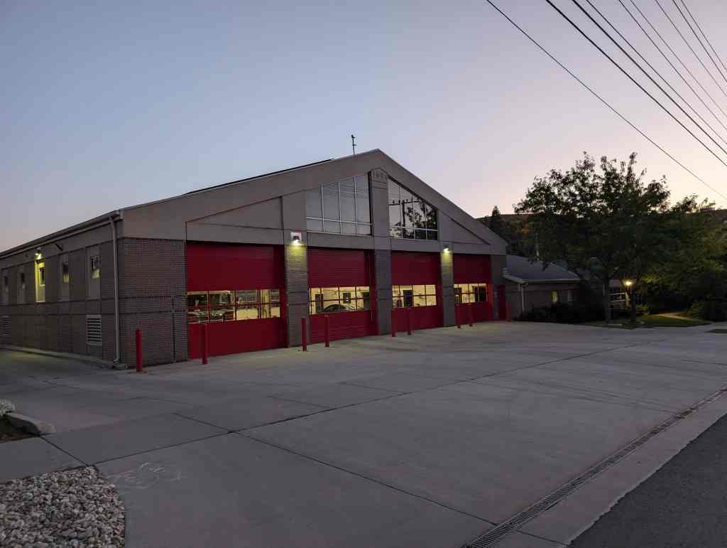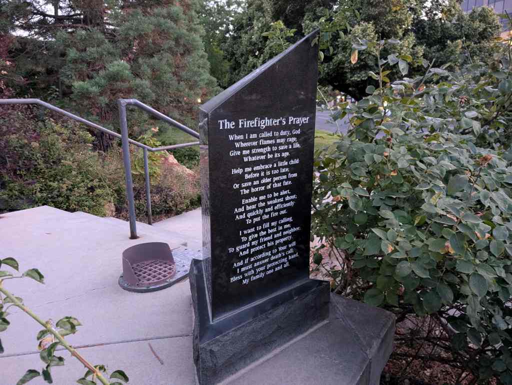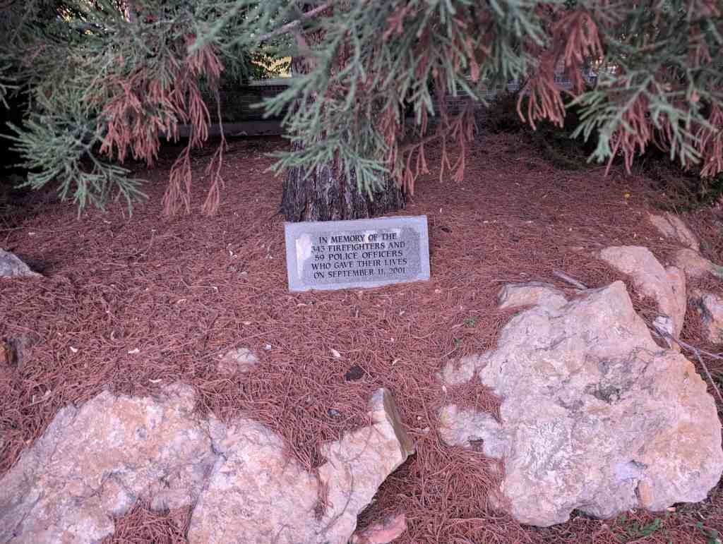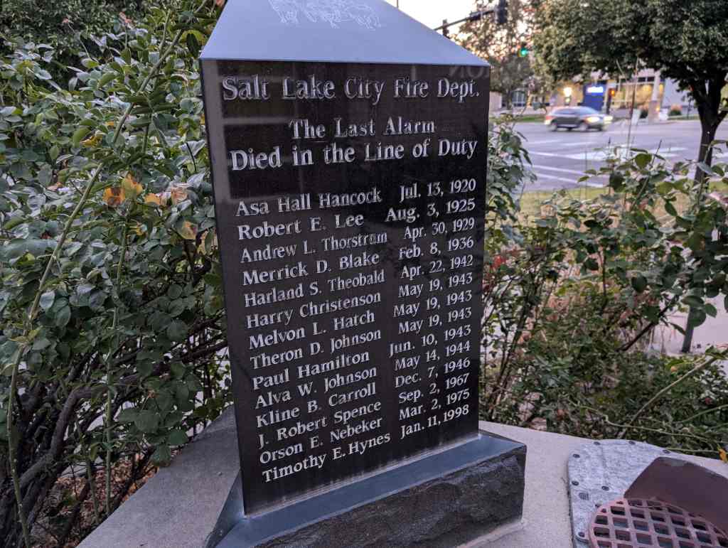 Sequoiadendron Giganteum (Giant Sequoia) at the Salt Lake City Fire Station #1, planted as a memorial to police and firefighters who died on September 11, 2001. Assuming it was planted that year or soon after, it’s had a good rate of growth. The base is on slightly lower ground than the flagpole, but the tree is still taller. – Sam Dunford