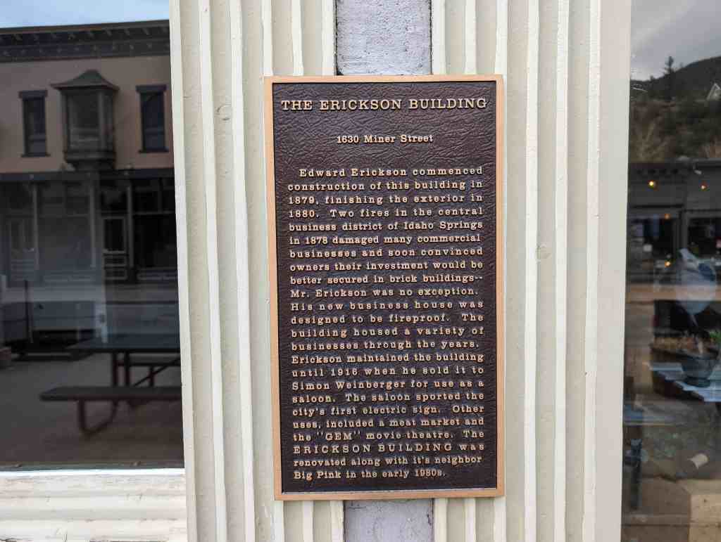 Edward Erickson commenced construction of this building in 1879, finishing the exterior in 1880. Two fires in the central business district of Idaho Springs in 1878 damaged many commercial businesses and soon convinced owners their investment would be better secured in brick buildings– Mr. Erickson was no exception. His new business house was designed to be fireproof. The building housed a variety of businesses through the years. Erickson maintained the building until 1916 when he sold it to Simon Weinberger for use as a saloon. The saloon sported the city’s first electric sign. uses, included a meat market and the “GEM” movie theatre. The ERICKSON BUILDING was renovated along with it’s neighbor Big Pink in the early 1980s.