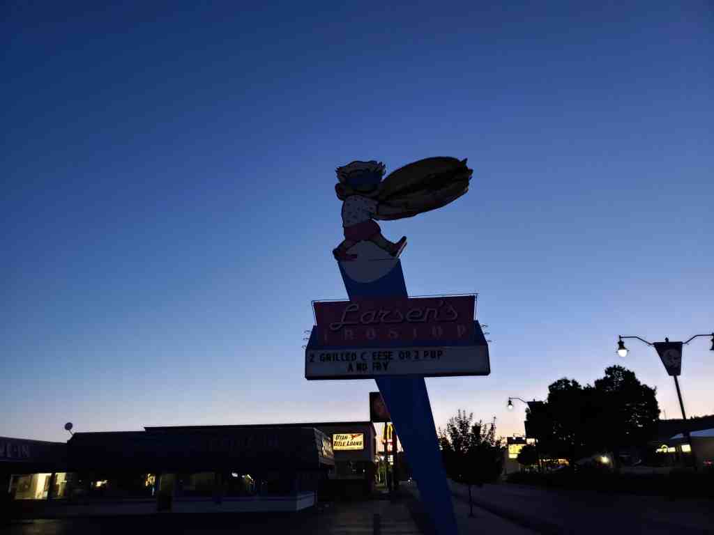 Larsen’s Frostop is located on St George Boulevard. Known for its signature piccadilly chips and neon sign, it opened in November 1964 as a Frostop Root Beer Cafe owned by Gale and Darlene Larsen. Frostop was a nationwide chain of franchised root beer stands. There were around 350 such stands in the US during the 1960s. The chain went out of business in the early 1980s. Originally, Larsen’s Frostop had a 14-foot rotating root beer mug sign which was typical for most franchisees. When the franchise folded, Larsen’s Frostop continued as a privately owned store. The mug was replaced with the current neon sign.*