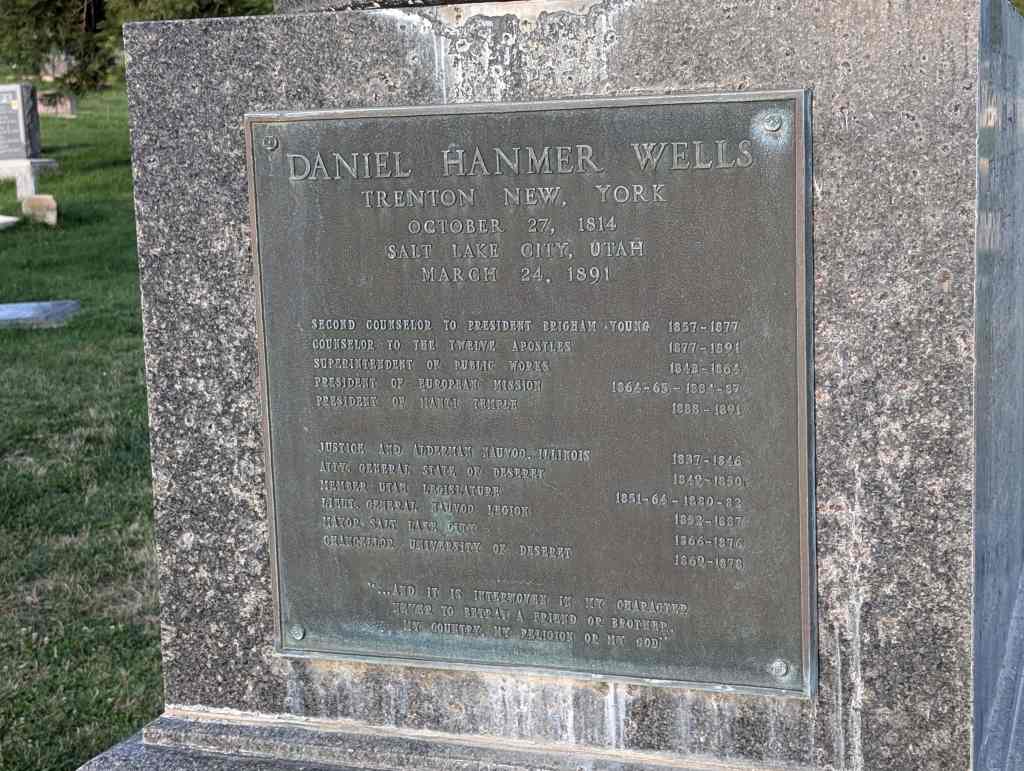 Daniel H. Wells died in Salt Lake City at the age of 76 and was buried in the Salt Lake Cemetery in Salt Lake City, Utah. His grave location is Plat – H, Block – 3, Lot 9NROD, Grave – 1, Tier – E.