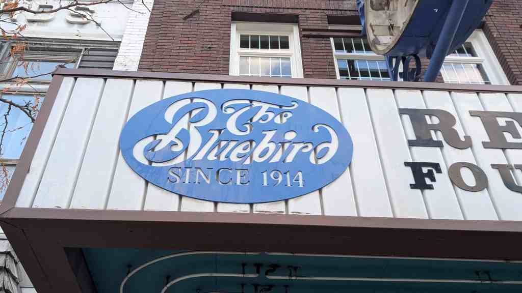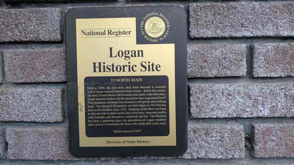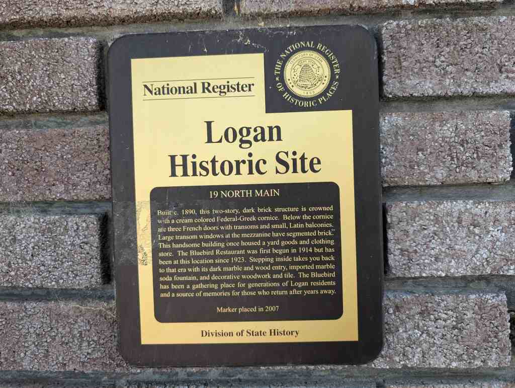 Built c. 1890, this two-story, dark brick structure is crowned with a cream colored Federal-Greek cornice. Below the cornice are three French doors with transoms and small, Latin balconies. Large transom windows at the mezzanine have segmented brick. This handsome building once housed a yard goods and clothing store. The Bluebird Restaurant was first begun in 1914 but has been at this location since 1923. Stepping inside takes you back to that era with its dark marble and wood entry, imported marble soda fountain, and decorative woodwork and tile. The Bluebird has been a gathering place for generations of Logan residents and a source of memories for those who return after years away.