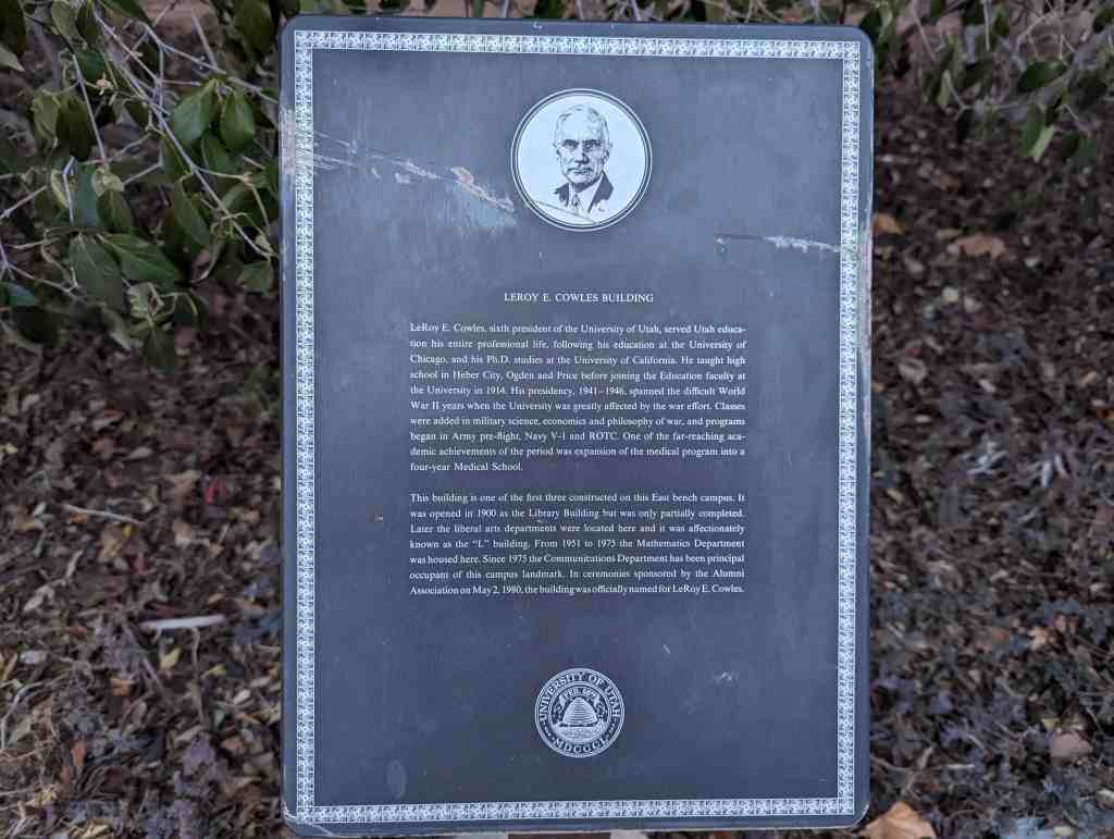 This building is one of the first three constructed on this East bench campus. It was opened in 1900 as the Library Building but was only partially completed. Later the liberal arts departments were located here and it was affectionately known as the “L” building. From 1951 to 1975 the Mathematics Department was housed here. Since 1975 the Communications Department has been principal occupant of this campus landmark. In ceremonies sponsored by the Alumni Association on May 2, 1980, the building was officially named for LeRoy E. Cowles.