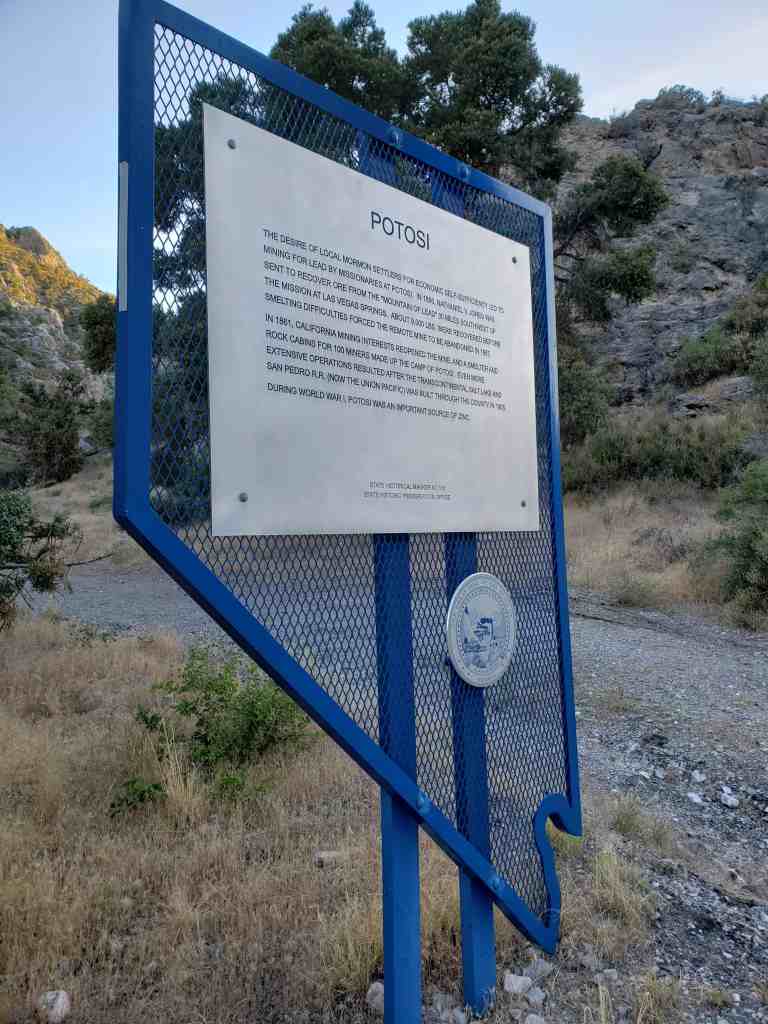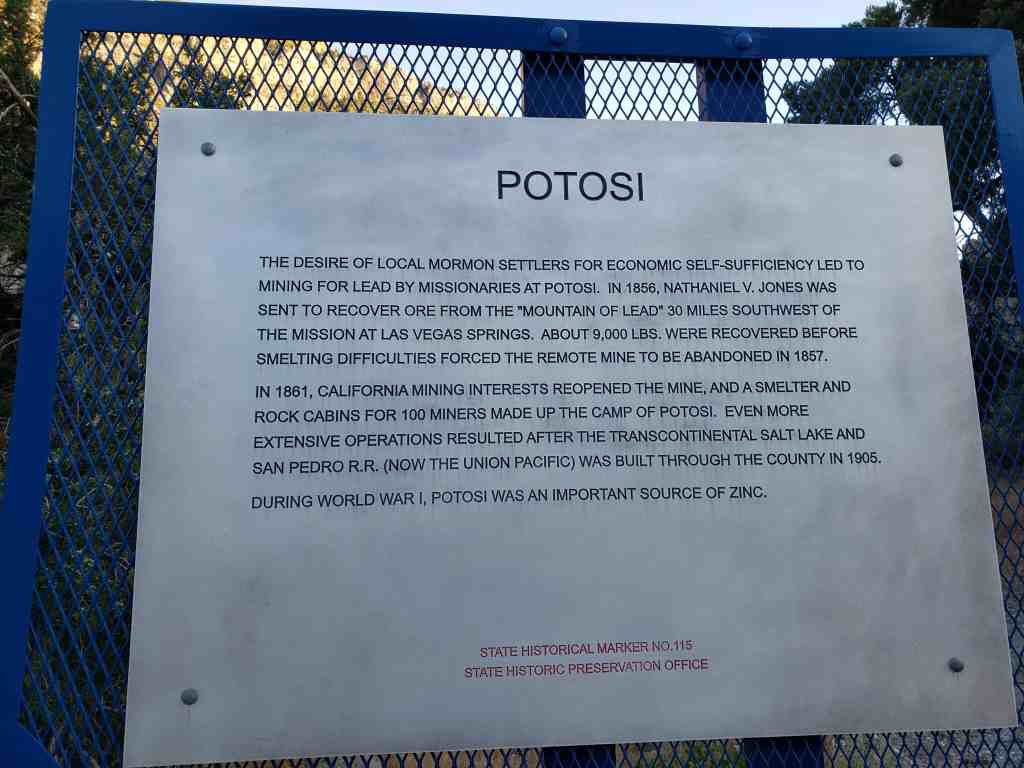The desire of local Mormon settlers for economic self-sufficiency led to mining by missionaries for lead at Potosi. In 1858, Nathaniel V. Jones was sent to recover ore from the “mountain of lead” 30 miles southwest of the mission at Las Vegas Springs. About 9,000 lbs. were recovered before smelting difficulties forced the remote mine to be abandoned in 1857. Potosi became the first abandoned mine in Nevada.