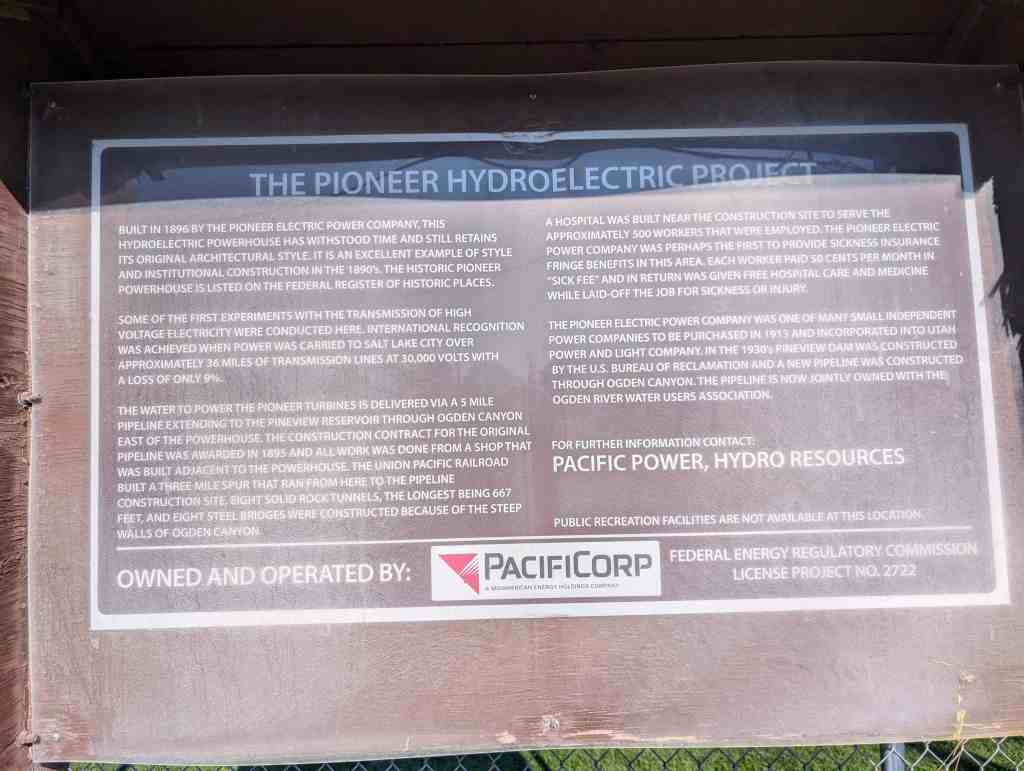 The water to power the pioneer turbines is delivered via a 5 mile pipeline extending to the Pineview Reservoir through Ogden Canyon east of the powerhouse. The construction contract for the original pipeline was awarded in 1895 and all work was done from a shop that was built adjacent to the powerhouse. The union pacific railroad built a three mile spur that ran from here to the pipeline construction site. Eight solid rock tunnels, the longest being 667 feet, and eight steel bridges were constructed because of the steep walls of Ogden Canyon.