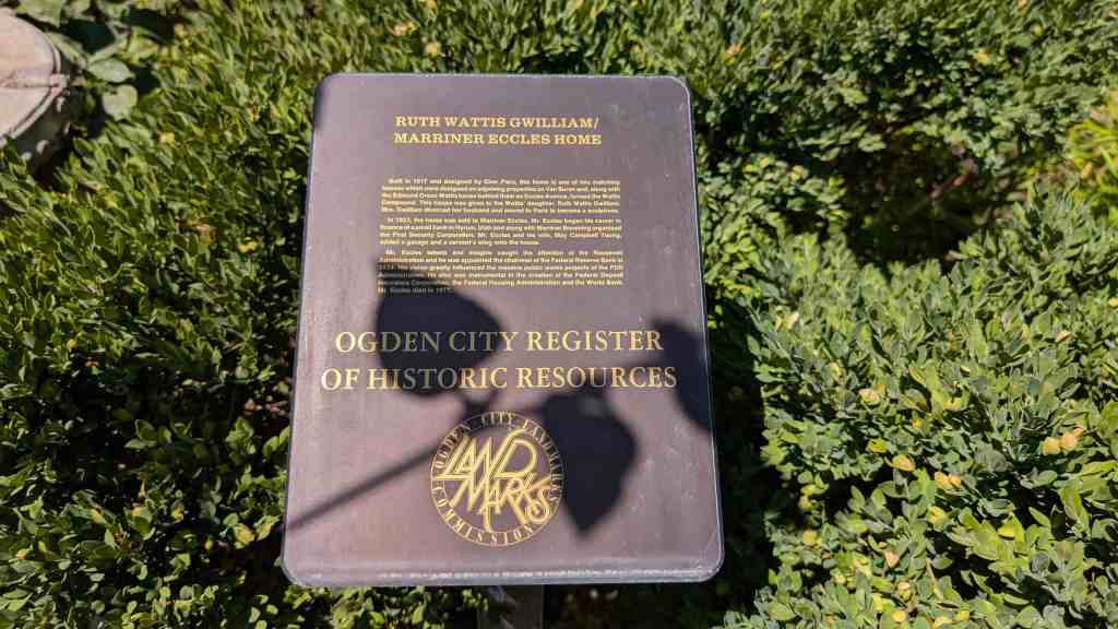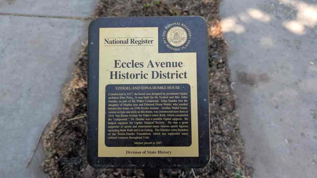 Constructed in 1917, the house was designed by prominent Ogden architect Eber Piers. It was built for Dr. Ezekiel and Mrs. Edna Dumke, as part of the Wattis Compound. Edna Dumke was the daughter of Martha Ann and Edmund Orson Wattis, who resided behind this home on 2540 Eccles Avenue. Another Wattis home, similar in type and style as this home, was constructed next door at 2541 Van Buren Avenue for Edna’s sister Ruth, which completed the “compound.” Dr. Dumke was a notable Ogden surgeon. He helped organize the Ogden Surgical Society. He was a great supporter of sports and entertained many famous sports figures, including Babe Ruth and Lou Gehrig. The Dumkes were founders of the Wattis-Dumke Foundation, which has supported many cultural ventures throughout Utah.