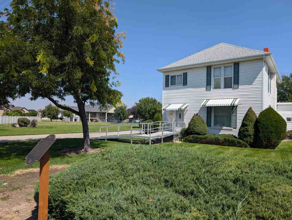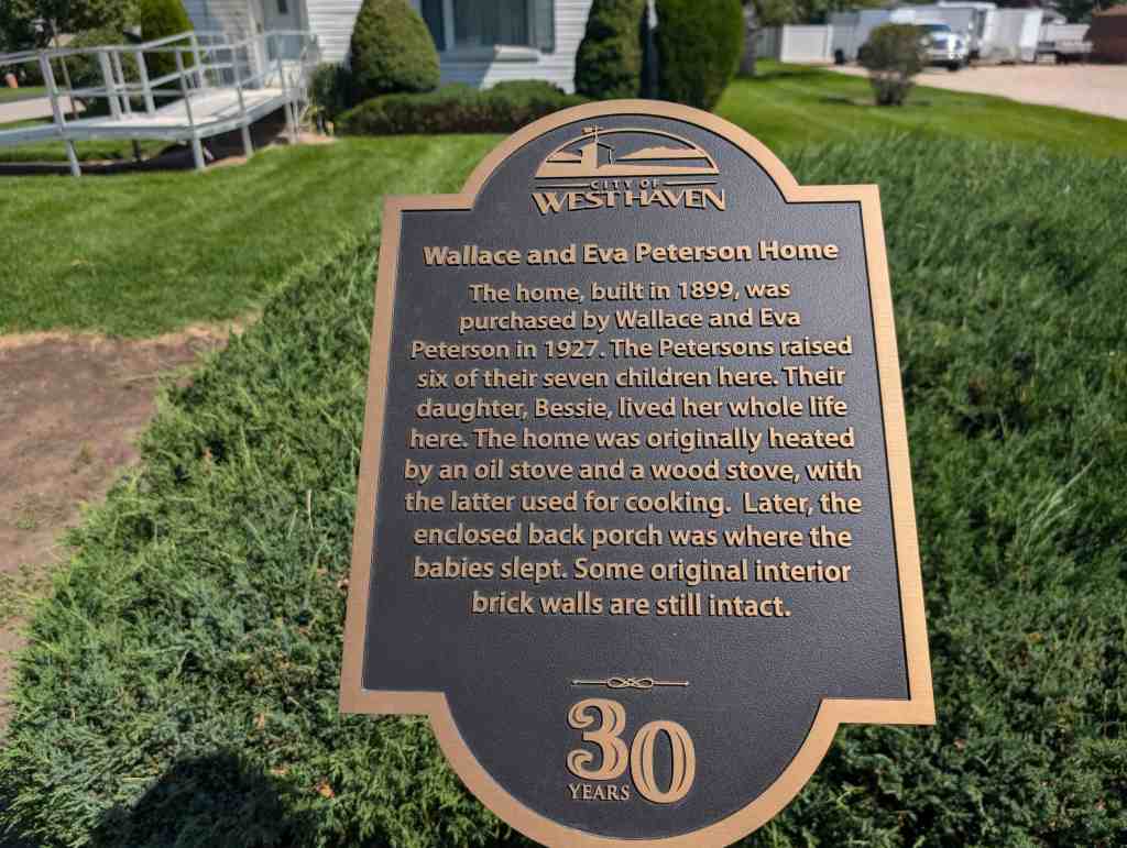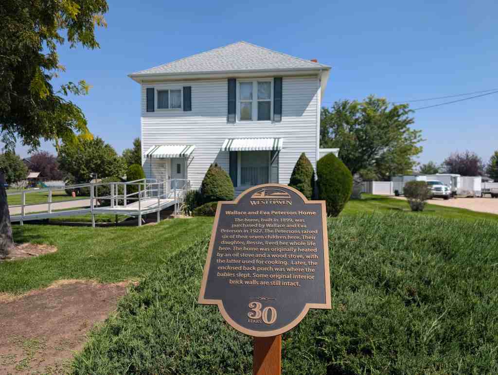 The home, built in 1899, was purchased by Wallace and Eva Peterson in 1927. The Petersons raised six of their seven children here. Their daughter, Bessie, lived her whole life here. The home was originally heated by an oil stove and a wood stove, with the latter used for cooking. Later, the enclosed back porch was where the babies slept. Some original interior brick walls are still intact.