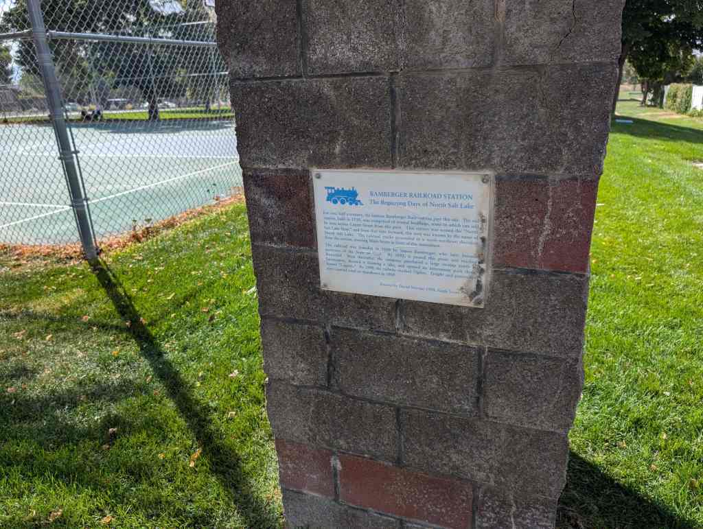 For over half a century, the famous Bamberger Railroad ran past this site. The old station, built in 1910, was comprised of several buildings, some of which can still be seen across Center Street from this park. This station was named the “North Salt Lake Stop,” and from that time forward, this area was known by the name of North Salt Lake. The railroad tracks proceeded in a north-northeast direction from the station, crossing Main Street in front of this monument.