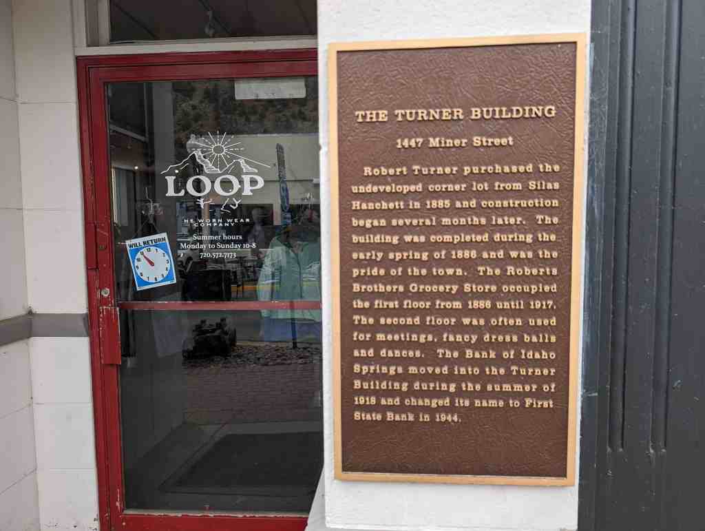 Robert Turner purchased the undeveloped corner lot from Silas Hanchett in 1885 and construction began several months later. The building was completed during the early spring of 1886 and was the pride of the town. The Roberts Brothers Grocery Store occupied the first floor from 1886 until 1917. The second floor was often used for meetings, fancy dress balls and dances. The Bank of Idaho Springs moved into the Turner Building during the summer of 1918 and changed its name to First State Bank in 1944.