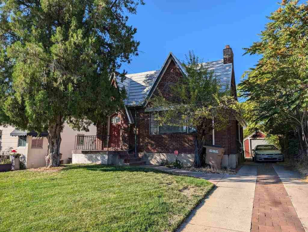 The one home that definitely seems out of place is the Patrick Healy, Jr. residence, now the Real Estate Exchange Offices. The last home built in the subdivision, the Healy residence has been described by architect, John Piers (son of Eber Piers) in glowing terms: “The Healy home is a masterful work in the development of Old English (Cottage Style) architecture. The house has a high pitched roof punctuated by a series of dormer windows, successfully contrasted with a stucco base to form an attitude of restful domesticity. The rounded arches, the tapered brick chimney, and a canopied entrance door are remindful of an era of English Art Nouveau. This is one of the most sensitive designs in Ogden.”