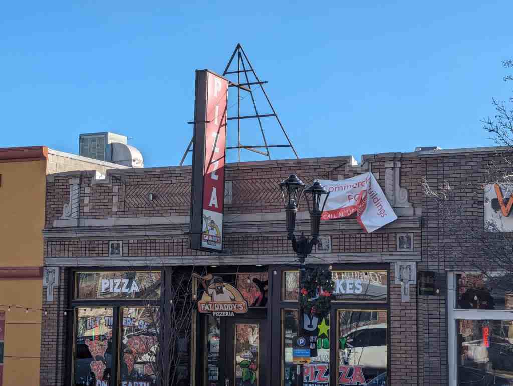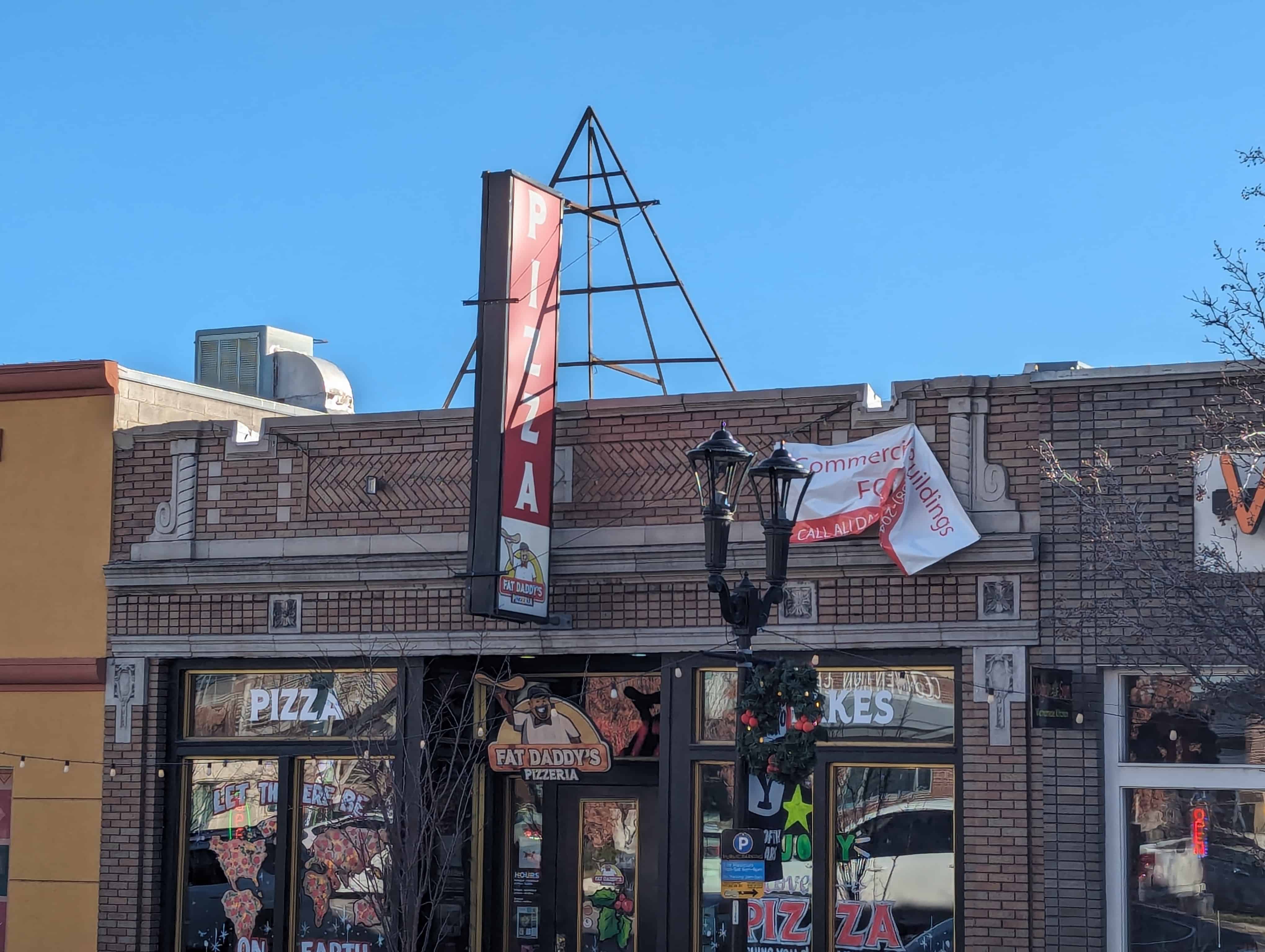 The inside of the building has been altered, but the outside façade of light and dark brick in geometric patterns is still intact, if obscured somewhat by a metal pole-supported sign.