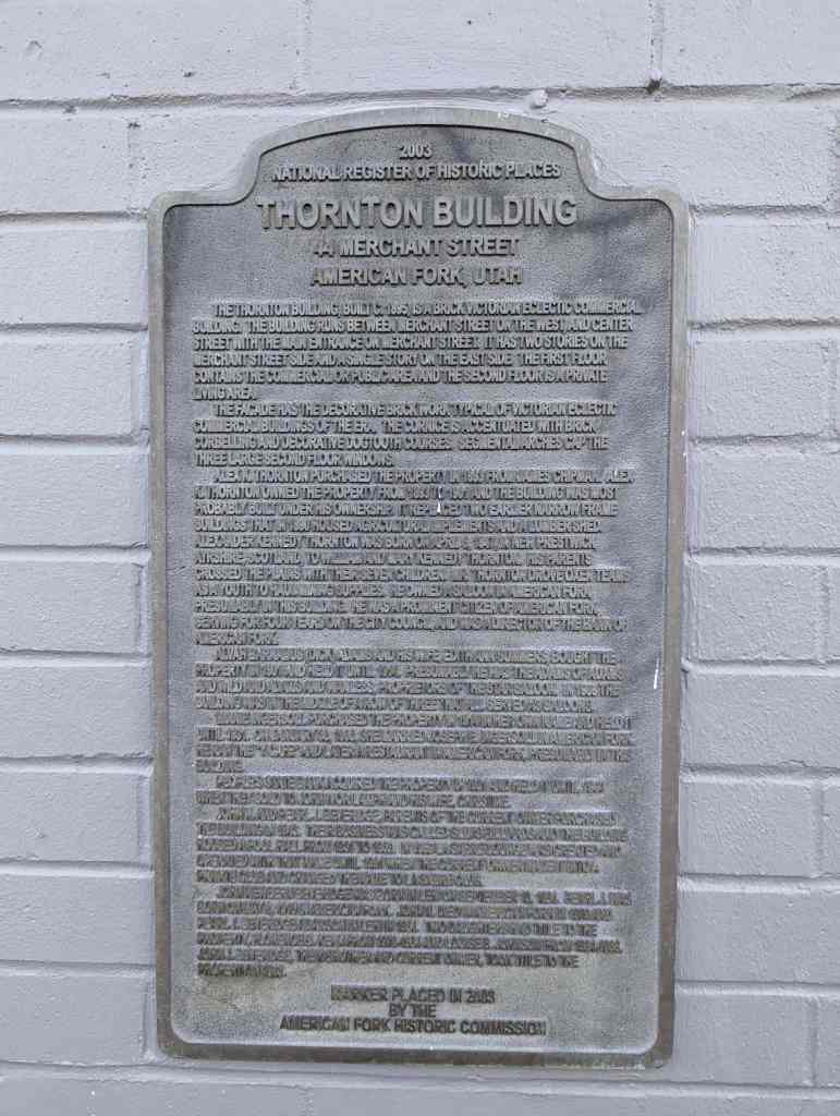 Alex K. Thornton purchased the property in 1893 from James Chipman Alex K. Thornton owned the property from 1893 to 1901 and the building was host probably built under his ownership it replaced two earlier narrow frame buildings that in 1890 housed agricultural implements and a lumber shed. Alexander Kennedy Thornton was born on April 6, 1847, in New Prestwick Ayrshire, Scotland to William and Mary Kennedy Thornton. His parents crossed the plains with their seven children. Mr. Thornton drove oxen teams as a youth to haul mining supplies. He owned a saloon in American Fork presumably in this building, he was a prominent citizen of American Fork, serving for four years on the city council and was a director of the Bank of American Fork.