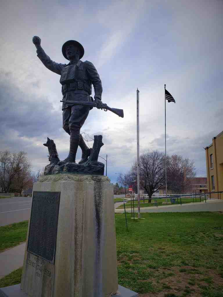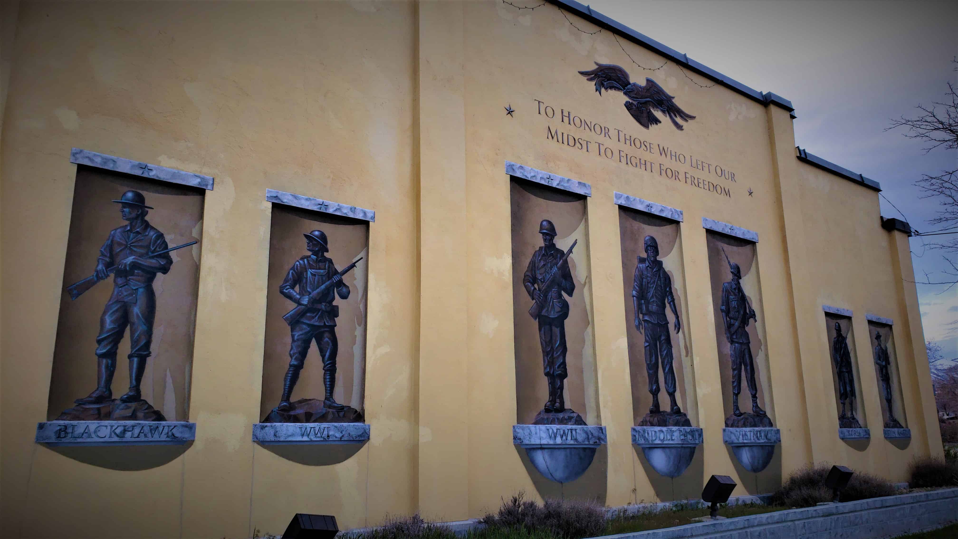 With the help of a federal grant and professional artists Bryan Spencer, Dean Kleven, and Jason Quinn, the armory now displays a larger-than-life mural of seven U.S. soldiers.(*)