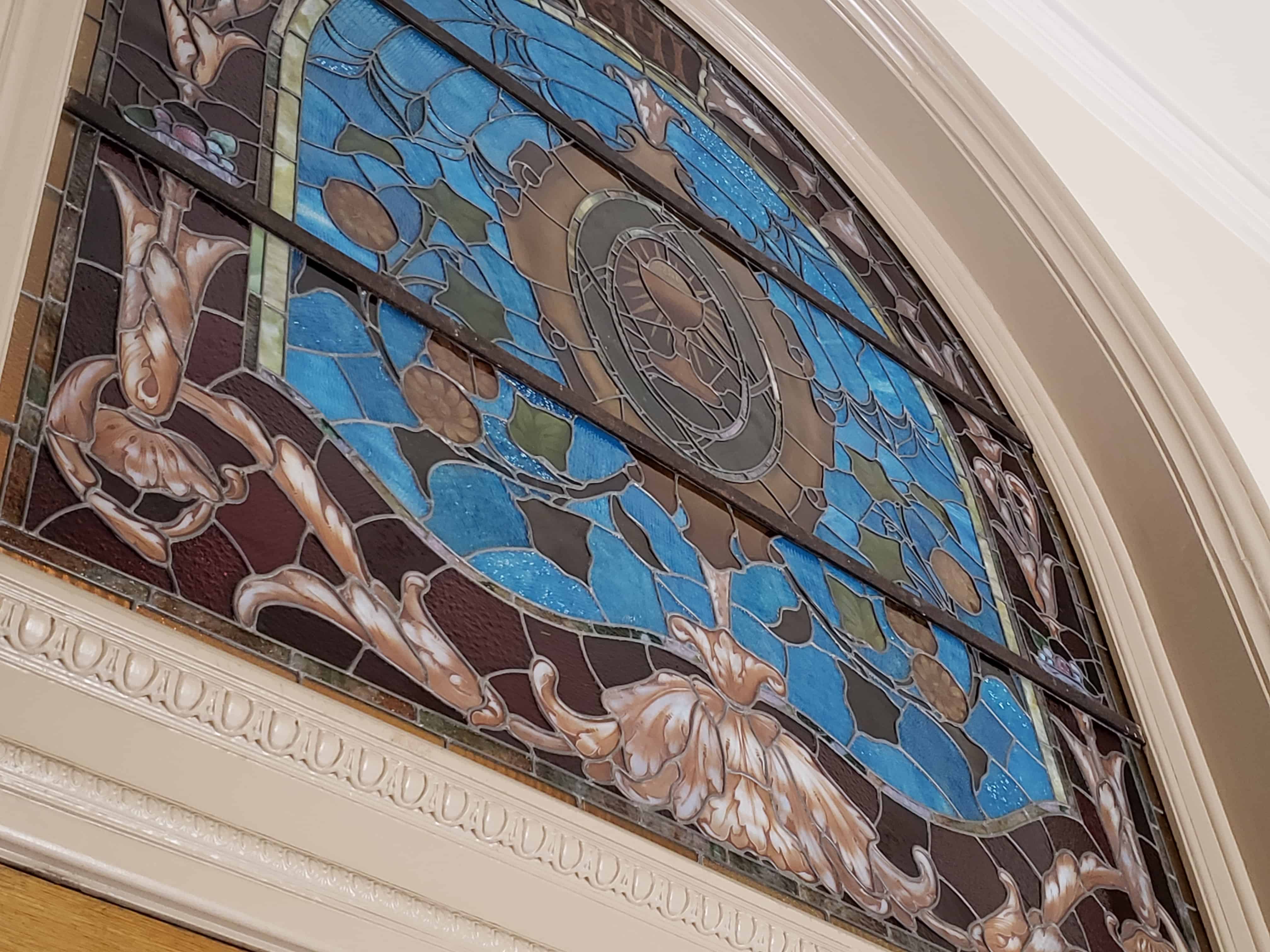 The mining fortunes that gave rise to South Temple’s grandest mansions also helped fund the construction of Utah’s first Catholic cathedral. The Cathedral of the Madeleine was built between 1899 and 1909 under the direction of the Right Reverend Lawrence Scanlan. It was designed by prominent Utah architect Carl M. Neuhausen as a Romanesque-style building with round Roman arches and rough-cut stone. Later, when Bishop Scanlan acquired additional funds for the project, the towers and pointed Gothic style portico were added to the plans. Upon Neuhausen’s death in 1907, Bernard O. Mecklenburg was hired to complete the roof and towers. While the exterior of the cathedral was substantially complete by 1909, the interior remained quite plain. In 1915, the Right Reverend Joseph Glass embarked on a three-year project to enhance the interior. Under the direction of noted American architect John Comes, the finest craftsmen of the day created paneling, painted murals, and carved wooden altarpieces for the building. The resulting ornate, polychrome interior is an outstanding example of the Gothic Revival style popular in the early 20th century. Comes also oversaw the completion of the exterior of the cathedral with the addition of the tympanum carving, tower gargoyles, and bi-level front steps.