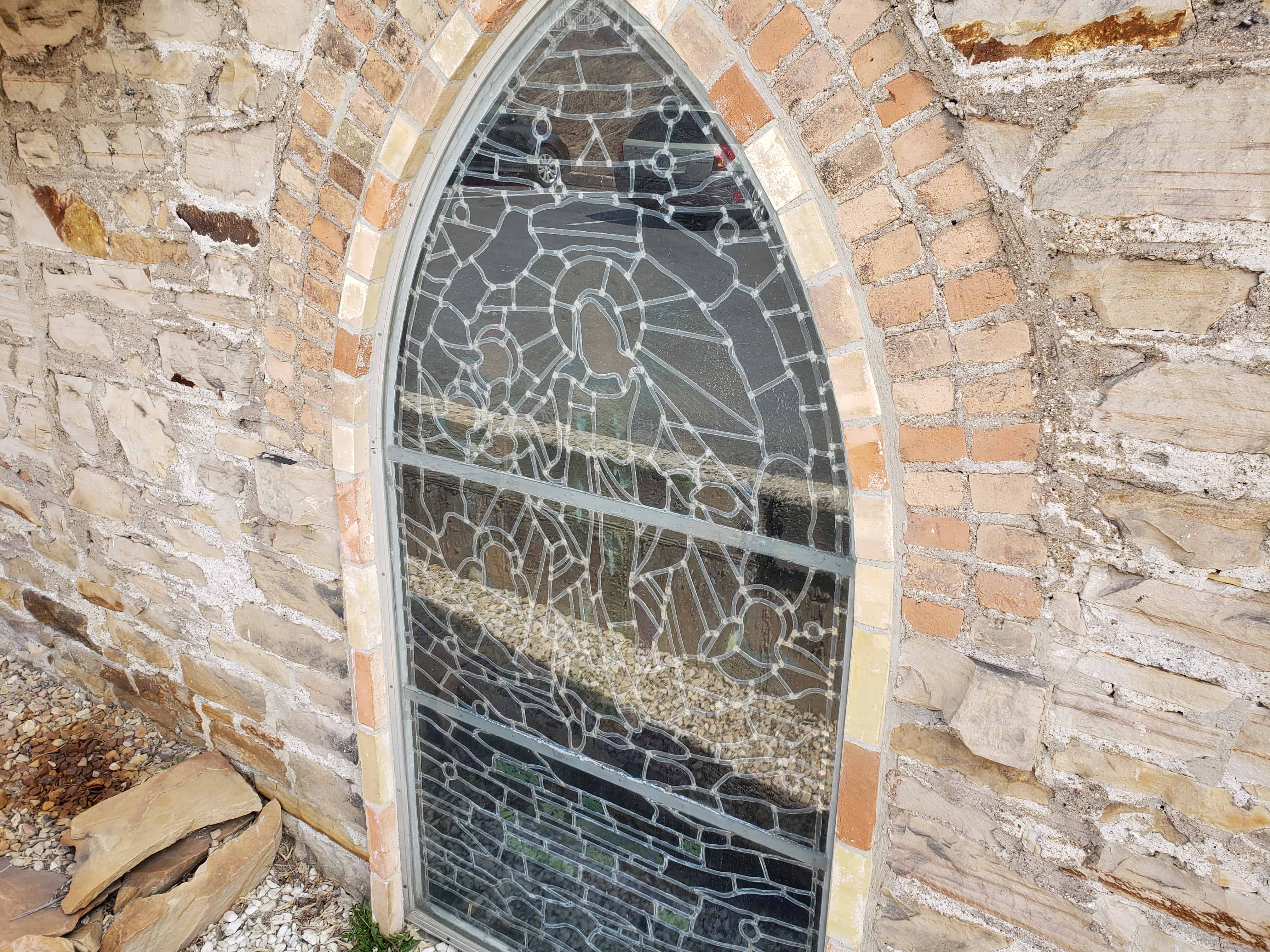 A stone giothic arch, with a castle stone keystone adorning a cross, spans the central entrance of the church’s facade. On either side of the entry are? two nine-over-nine wood frame double-hung windows. Two window openings exist on the attic level, appearing as second story windows and symmetrical in appearance to those of the school. A stone marker, with a cross and engraved date of “1884”, is above the attic windows. A bell tower, topped with a cross, near the front of the roof, is much smaller and less ornate than the original.