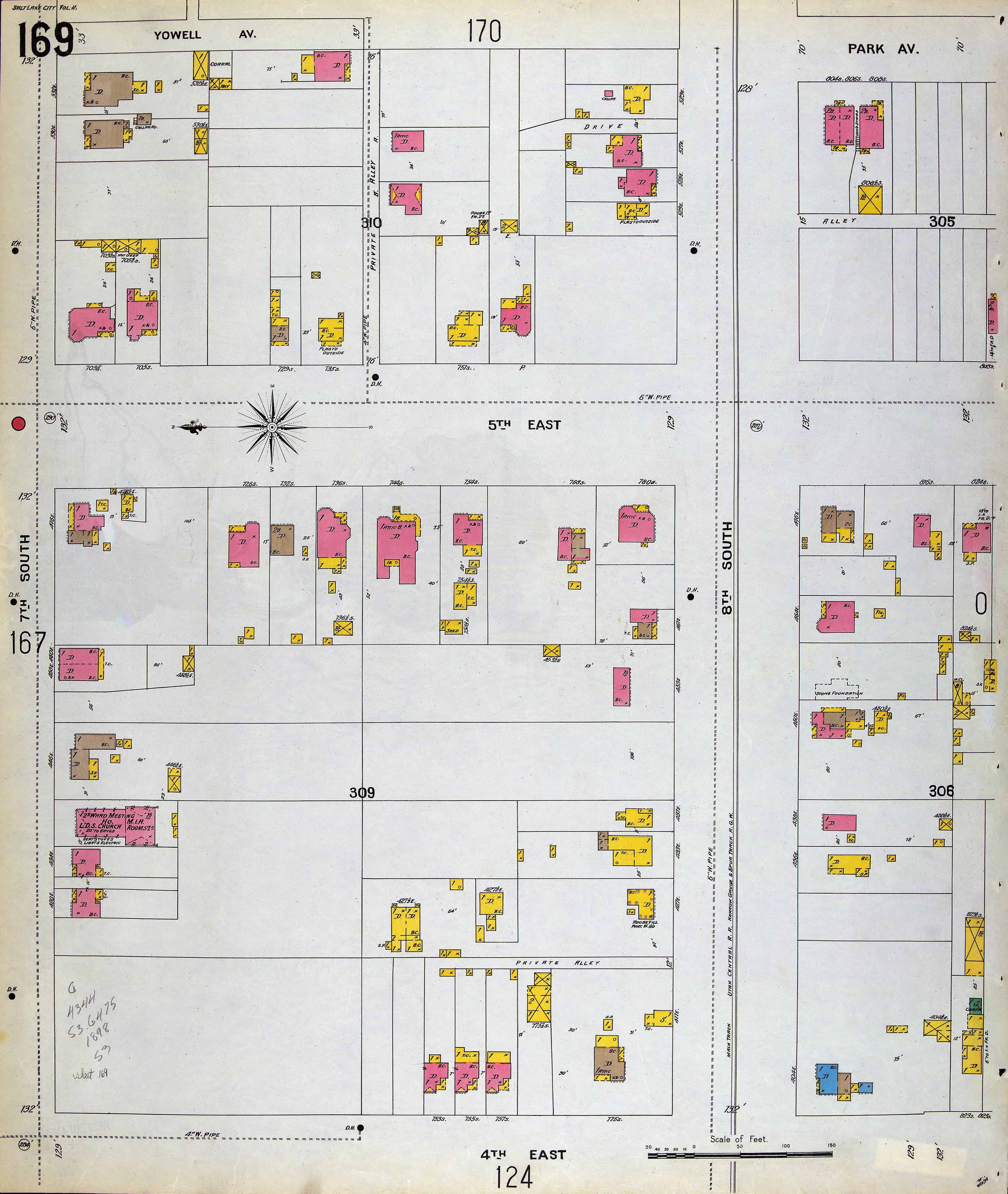 An adobe school house was erected on 7th South St. between 4th and 5th East street in 1852. This was replaced by a brick building in 1883, which, after the erection of a fine ward chapel on the corner of 7th South and 5th East streets, was used as a knitting factory.”
