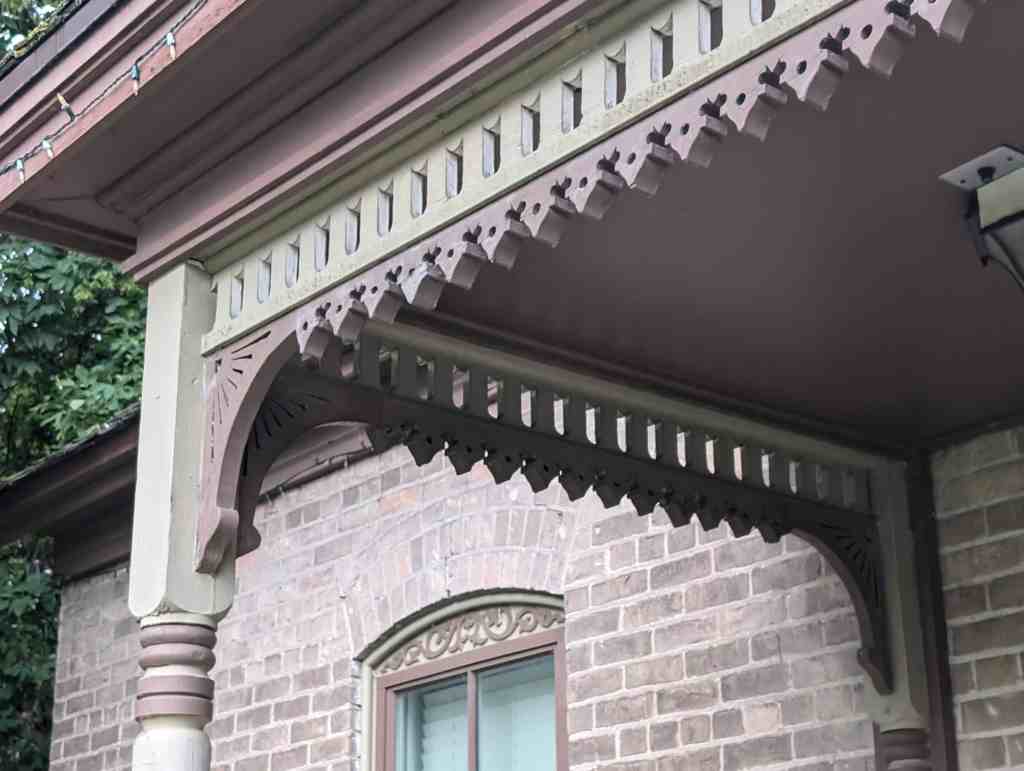 Family tradition suggests that the home was constructed just after the Civil War, but some elements of the house such as the segmental arched windows, and Eastlake-style trim more-likely date the house from the 1870s. The red brick masonry, which is laid in American or common bond with headers every seventh course, is consistent throughout the structure and appears to have been built as a single unit. However, each elevation is distinct. The facade (north elevation) appears similar to a symmetric hall-parlor with a main door flanked by windows. The ridge is parallel to the street with brick chimneys at either end. A small concrete porch (probably circa 1915) projects from the front door. It has a hipped roof supported by lathe-turned posts with decorative brackets. The porch trim and balustrade is original and painted a light yellow. The cornice boards are also painted yellow. They are fairly plain and narrow with a single bead. The windows are two-over-two double-hung windows in a wood sash. The windows feature segmental relieving arches of rowlock brick and stone sills with a decorative inset under the arch. All windows on the home are currently boarded up. Some glass has been broken, but most window features are intact.