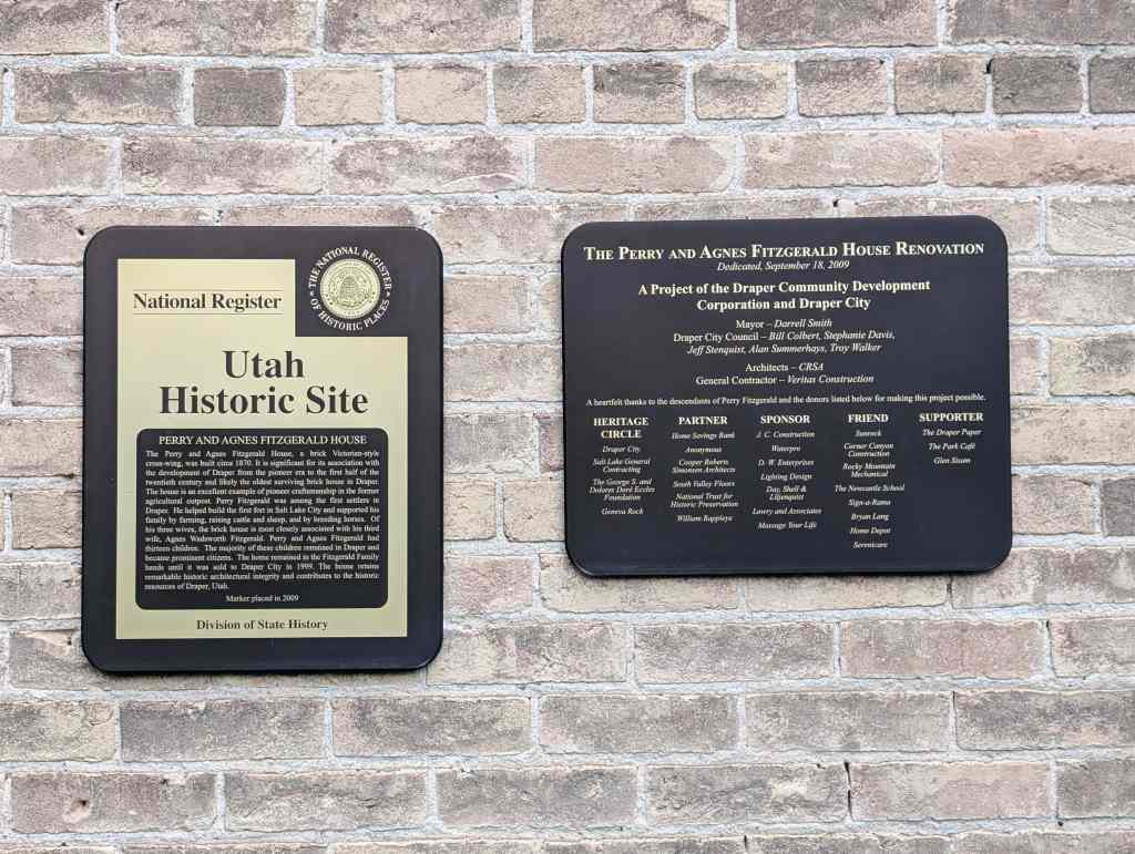 The Perry and Agnes Fitzgerald House, a brick Victorian-style cross-wing, was built circa 1870. It is significant for its association with the development of Draper from the pioneer era to the first half of the twentieth century and likely the oldest surviving brick house in Draper.