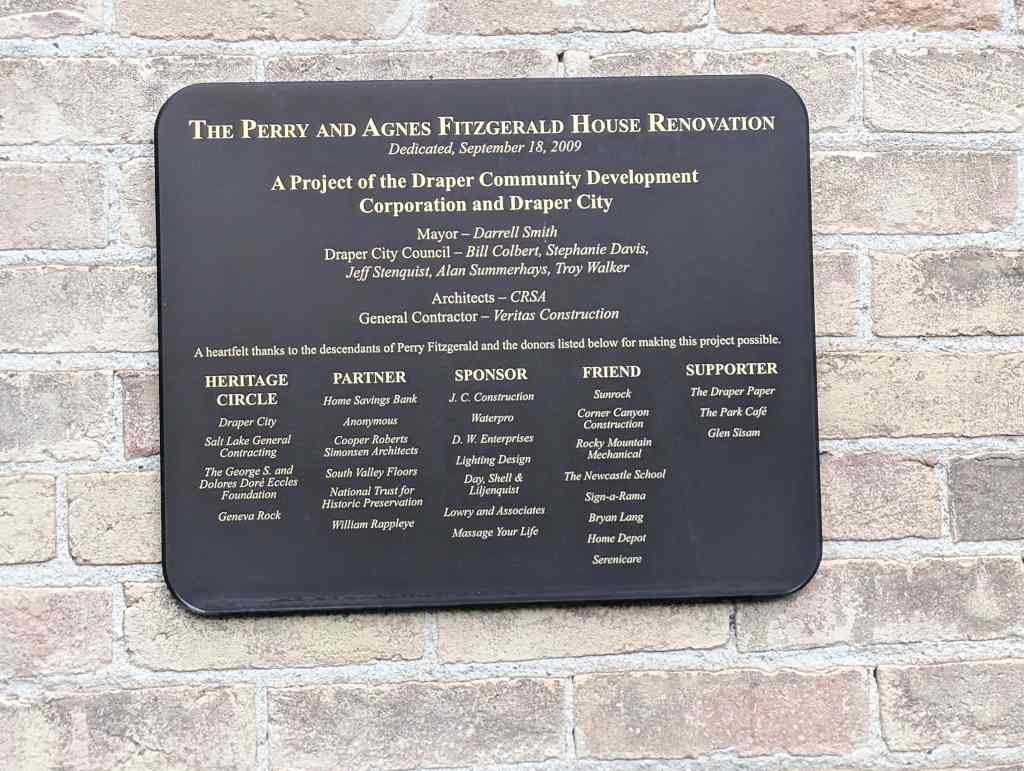 The house is an excellent example of pioneer craftsmanship in the former agricultural outpost. Perry Fitzgerald was among the first settlers in Draper. He helped built the first fort in Salt Lake City and supported his family by farming, raising cattle and sheep, and by breeding horses. Of his three wives, the brick house is most closely associated with his third wife, Agnes Wadsworth Fitzgerald. Perry and Agnes Fitzgerald had thirteen children. The majority of these children remained in Draper and became prominent citizens. The home remained in the Fitzgerald family hands until it was sold to Draper City in 1999. The house retains remarkable historic architectural integrity and contributes to the historic resources of Draper, Utah.