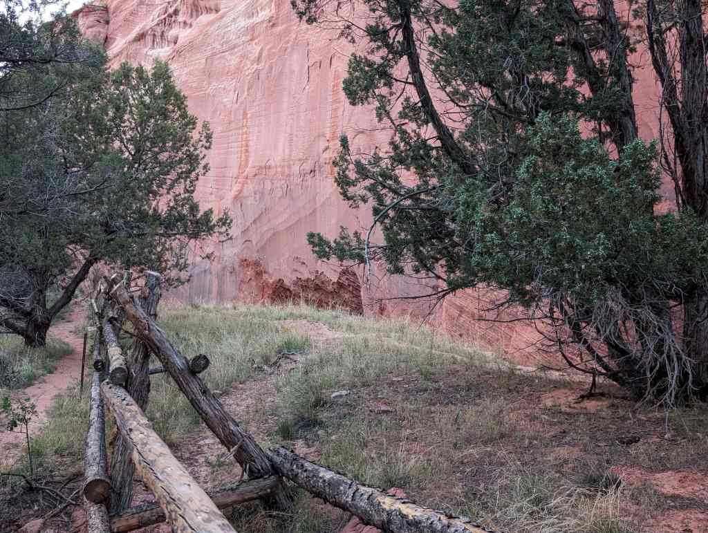The cliff dwelling, is located under a semicircular overhang, 53 m long and 12 m deep, in the low enclosed sandstone cliff at the head of an unnamed eastern tributary of Cottonwood Canyon. The midden area which spills down the slope in front of the rock shelter is 530 m square. A spring flowed at the north end of the overhang at one point. Vegetation outside, the shelter currently consists of oak, cedar and pinion pine.