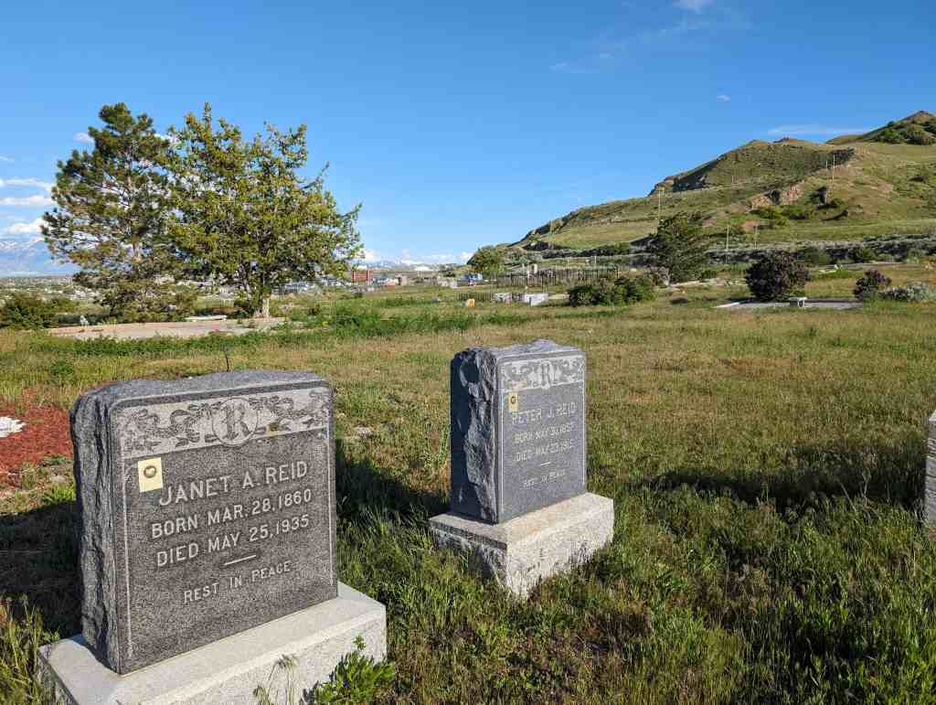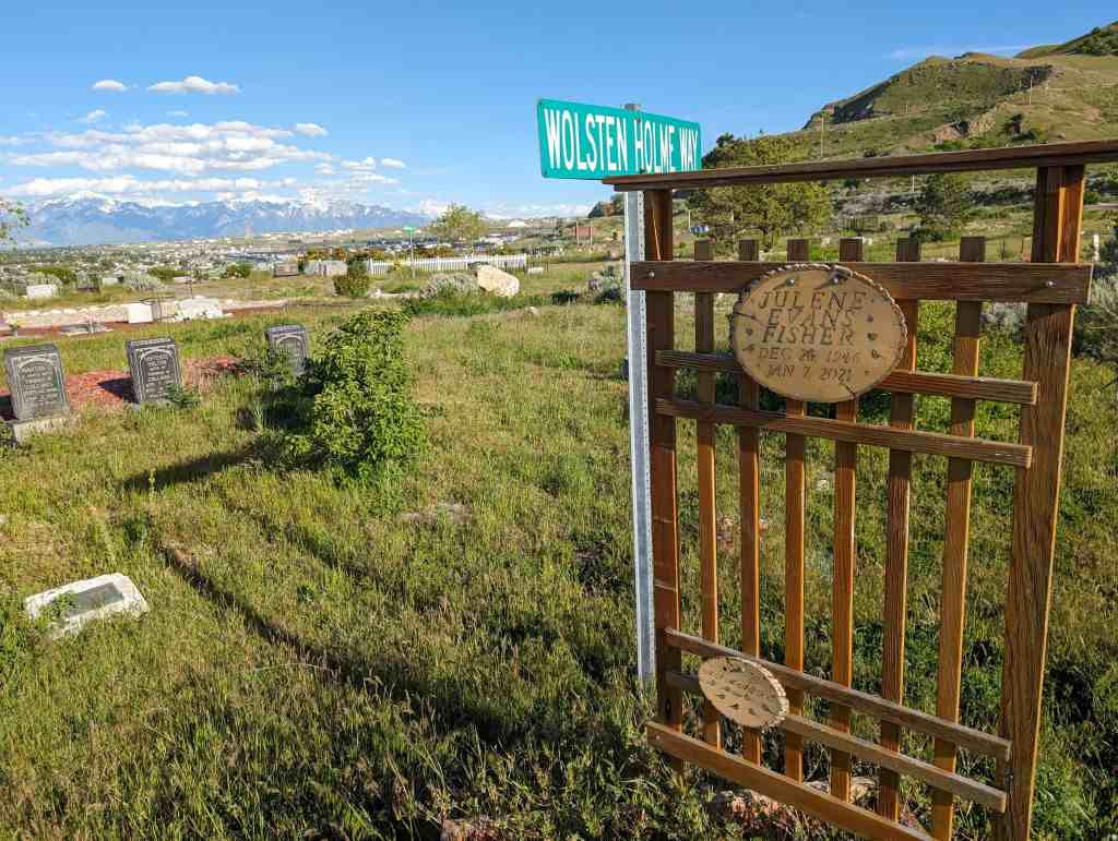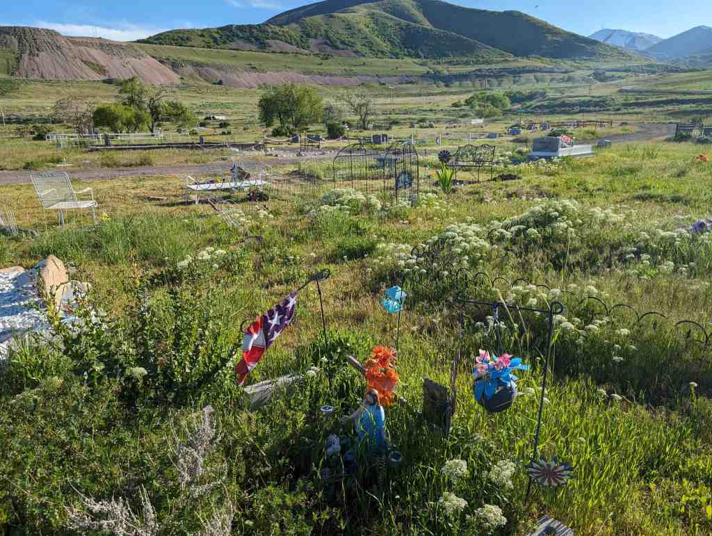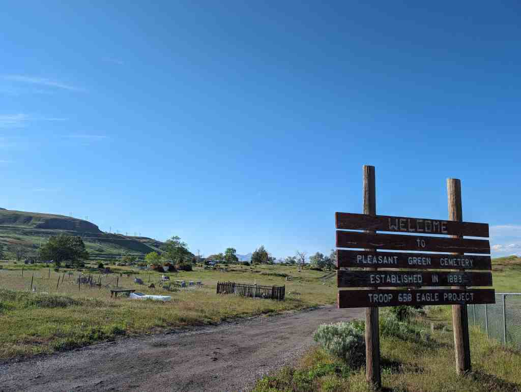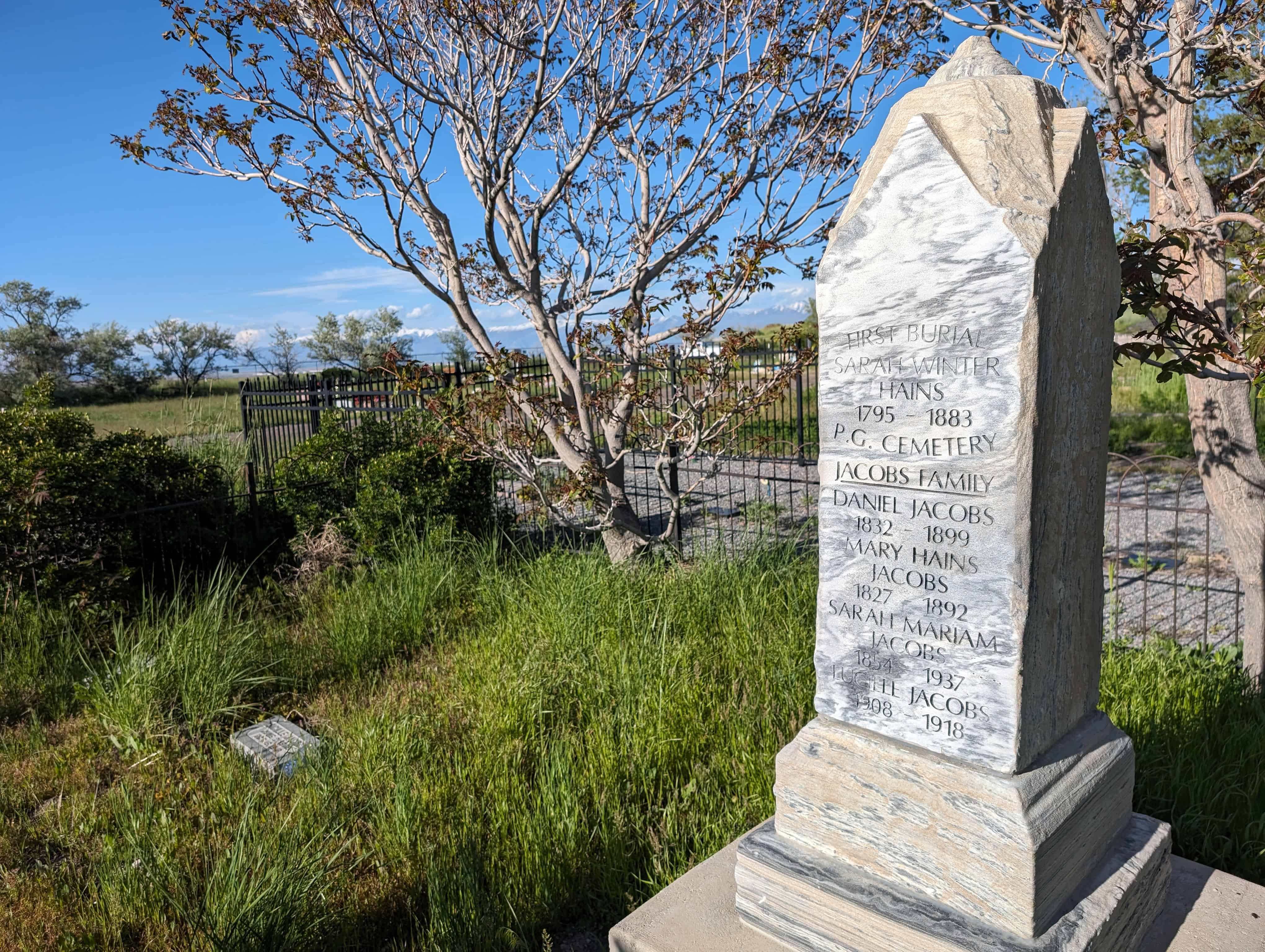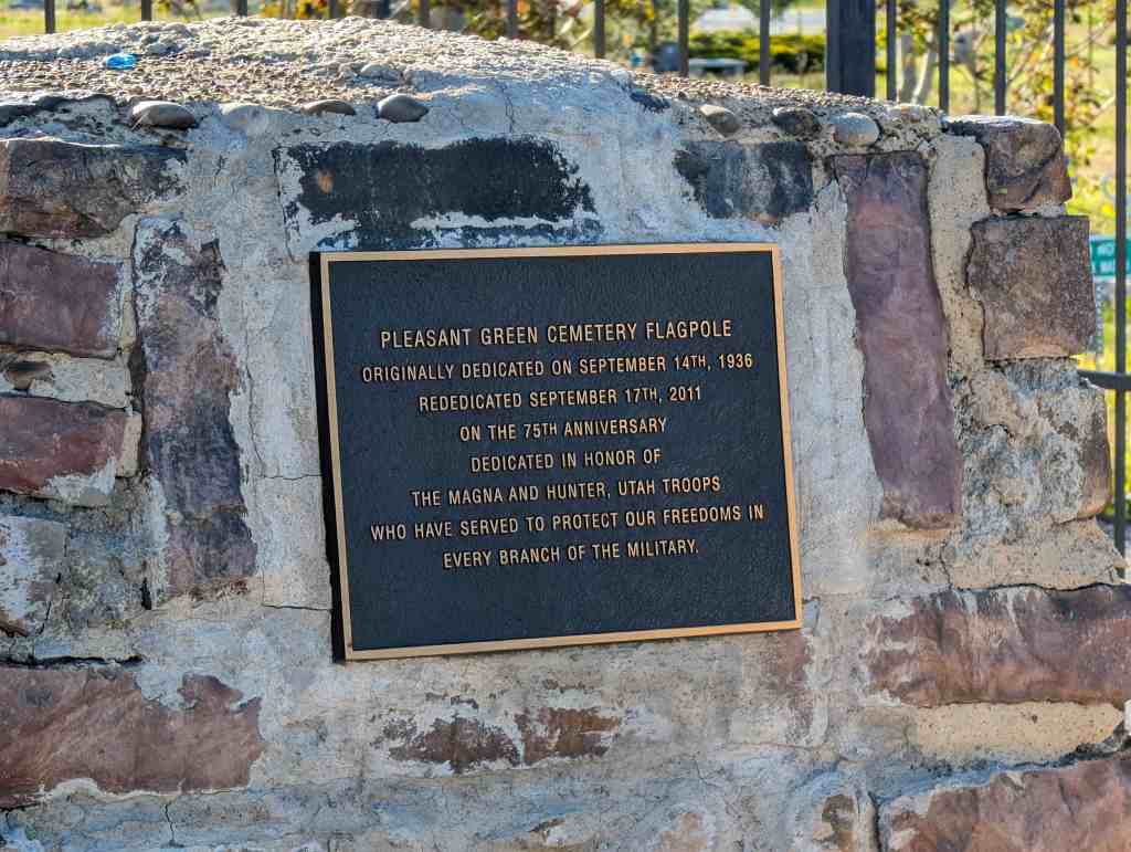 Pleasant Green Cemetery (D.U.P. Historic Marker #594) says: The Pleasant Green Cemetery was founded in 1883 on 10 acres of land donated by Nathan Smith. It was founded by Daniel Jacobs, Hiram Spencer, Samuel Taylor, George Perkins, Osmond LeCheminant, James Bertoch and Lehi Nephi Hardman. Lehi Nephi Harman was asked to be the caretaker. Daniel Jacob’s grandmother, Sara Haines, died in 1883 while visiting from New York and was the first person buried here. This was the first cemetery west of the Jordan River. Many of the original settlers of the western Salt Lake Valley, and unincorporated “towns” such as Magna, Hunter, Pleasant Green, Ragtown, and Coonville, are buried here. The Church of Jesus Christ of Latter-Day Saints owned the cemetery from 1883-1993 and created the Pleasant Green Cemetery Preservation and Development Association in 1983. The Association turned the cemetery over to Magna City in 2020.