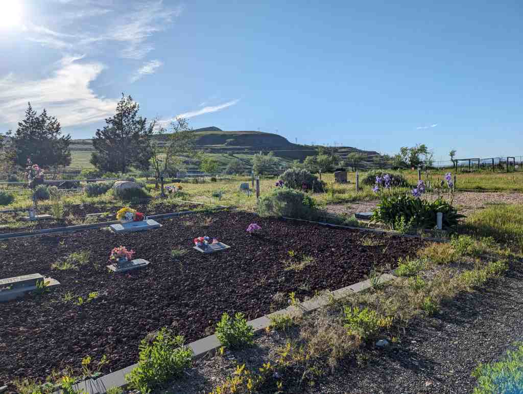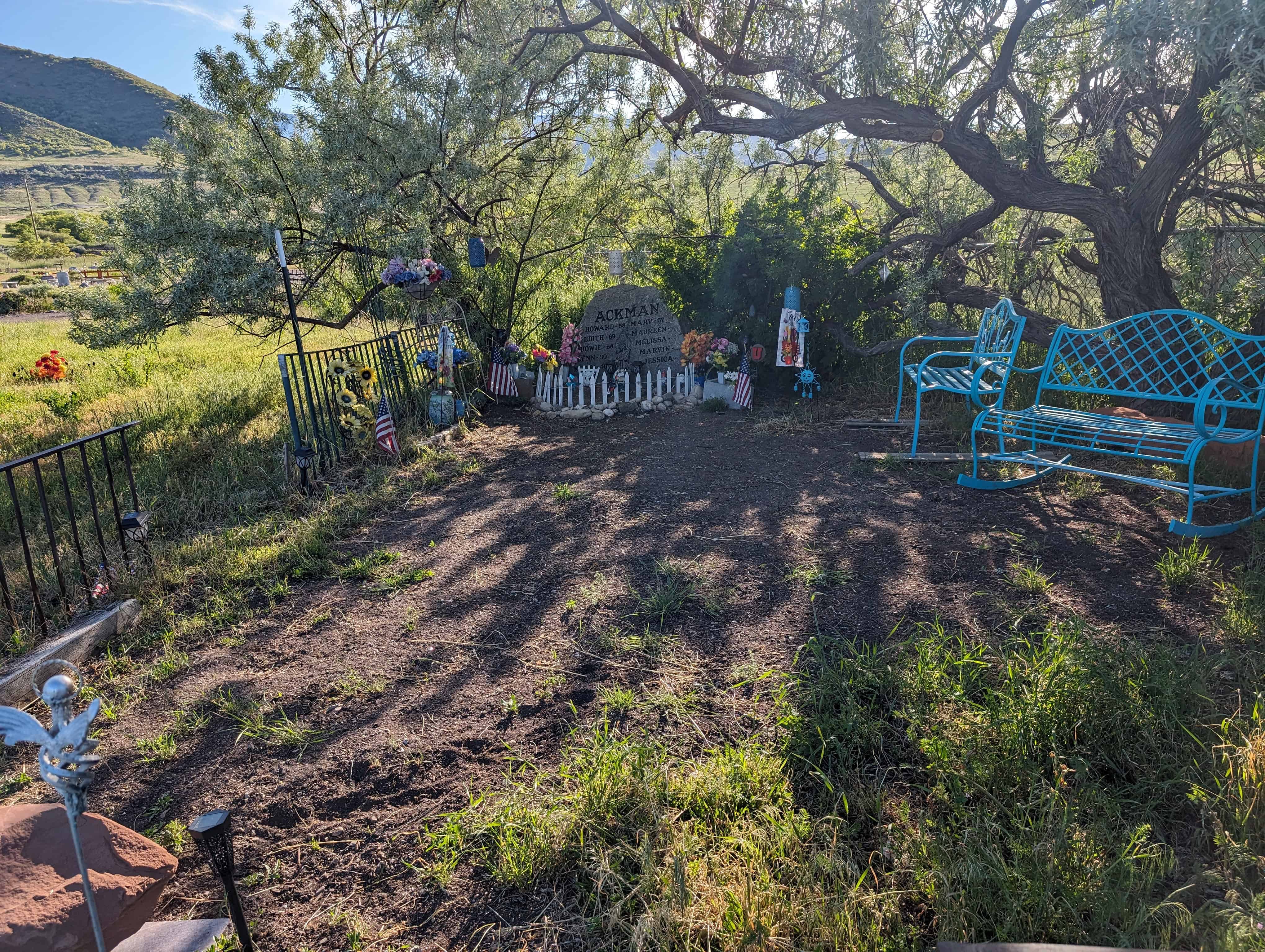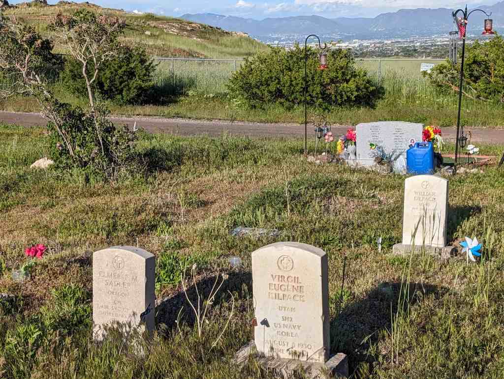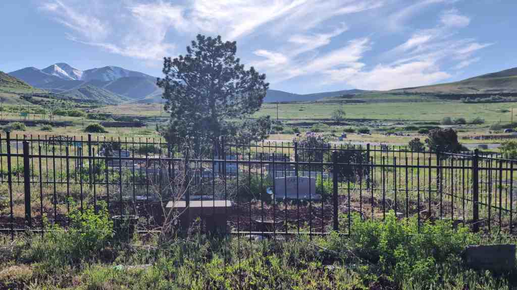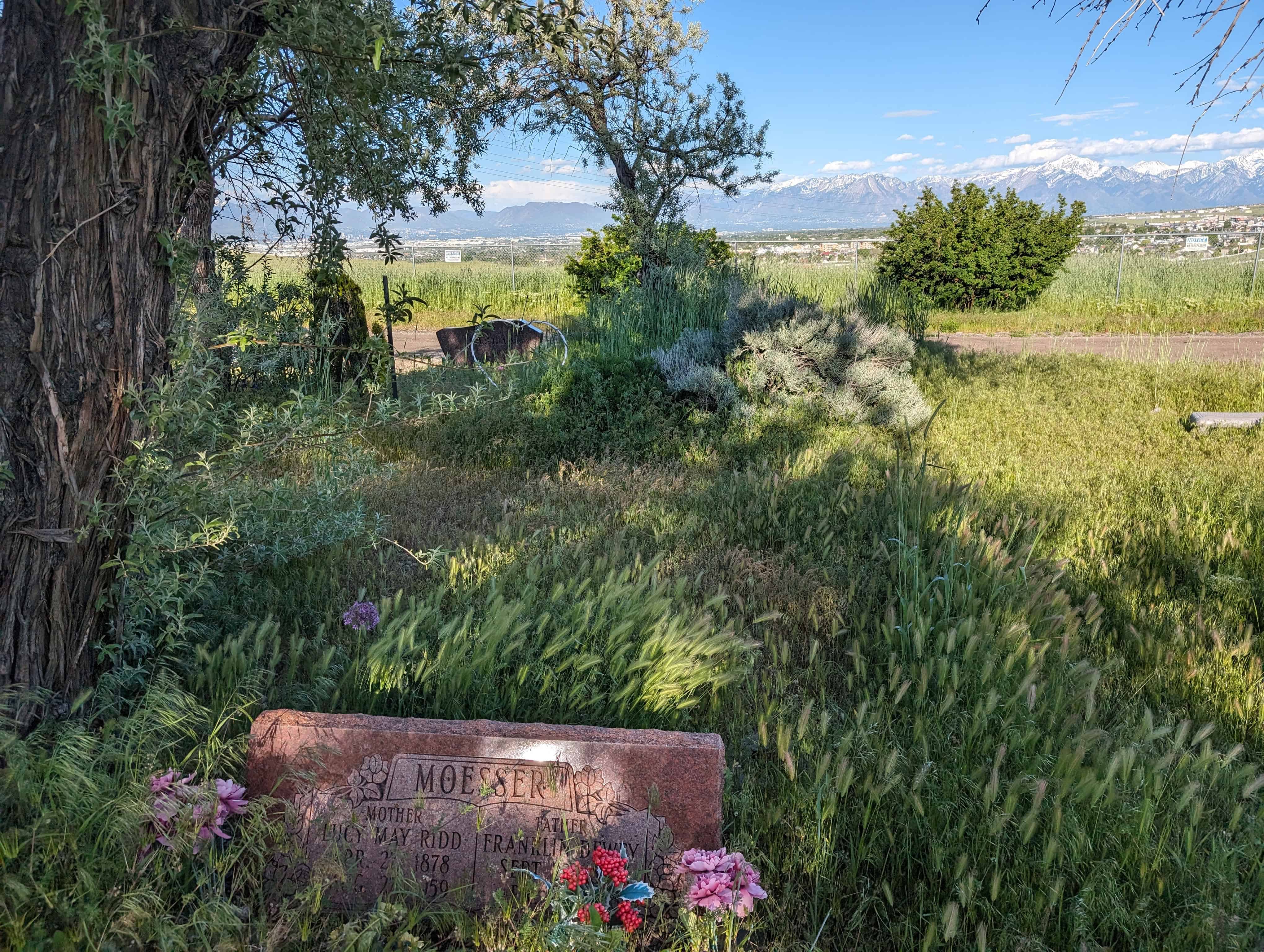 Pleasant Green Cemetery (D.U.P. Historic Marker #594) says: The Pleasant Green Cemetery was founded in 1883 on 10 acres of land donated by Nathan Smith. It was founded by Daniel Jacobs, Hiram Spencer, Samuel Taylor, George Perkins, Osmond LeCheminant, James Bertoch and Lehi Nephi Hardman. Lehi Nephi Harman was asked to be the caretaker. Daniel Jacob’s grandmother, Sara Haines, died in 1883 while visiting from New York and was the first person buried here. This was the first cemetery west of the Jordan River. Many of the original settlers of the western Salt Lake Valley, and unincorporated “towns” such as Magna, Hunter, Pleasant Green, Ragtown, and Coonville, are buried here. The Church of Jesus Christ of Latter-Day Saints owned the cemetery from 1883-1993 and created the Pleasant Green Cemetery Preservation and Development Association in 1983. The Association turned the cemetery over to Magna City in 2020.