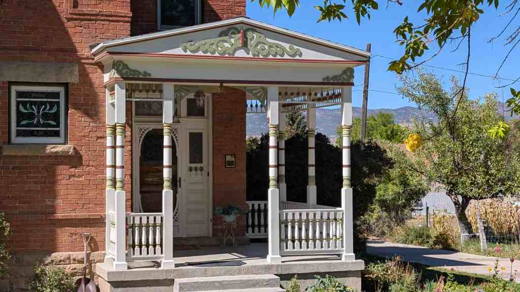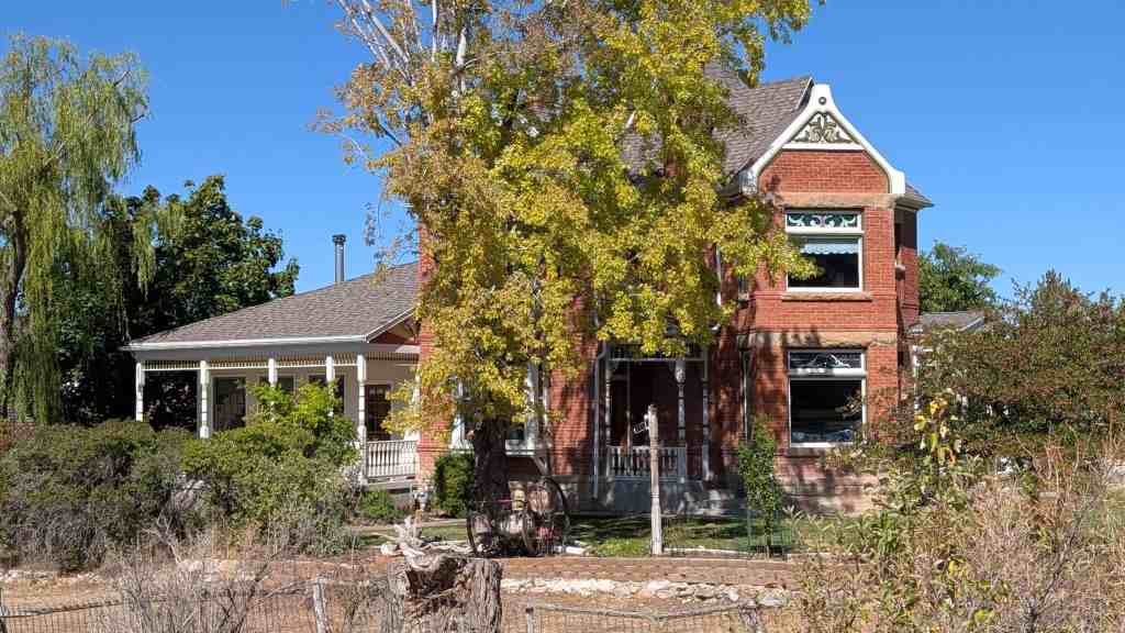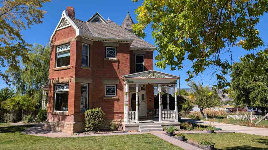 This Victorian Eclectic and Queen Anne style house remains as one of the most distinctive architectural landmarks of Manti. The house, which initially consisted of only two rooms, was begun in 1896 by Lewis R. (L.R.) Anderson. After he returned from a two-year LDS mission, he began construction on the staircase and upper bedrooms, adding the back bathroom, kitchen, and basement by 1899. The last addition was made in 1915 when he built a large bay window in the dining room to display Clara’s plants. The chicken coop and brick carriage house were built in the 1920s.