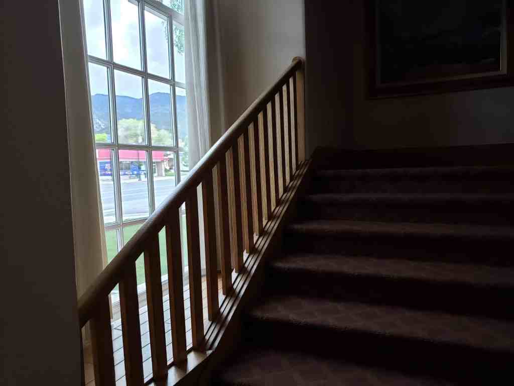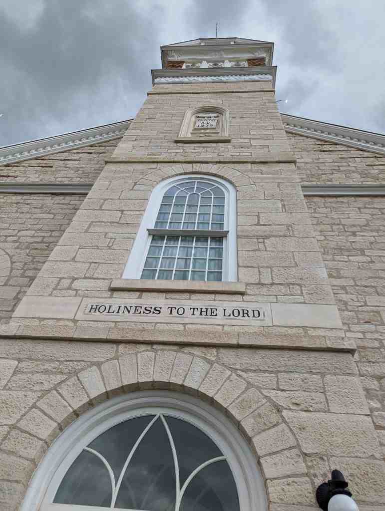 The temple is 171 feet long and 95 feet wide. It is built of local oolitic limestone of a warm cream color. The towers on each end are topped by bell-shaped roofs which are influenced by Victorian architectural fashions The front of the Temple is on the east as with all Mormon Temples and the rear fronts the highway. The interior is striking in its simple elegance. Hardware, woodwork with its graceful arches, heavy doors and finely cut mouldings, and decorating all indicate skilled workmanship. In the basement is a baptismal font resting on the backs of twelve cast life-size oxen. The main floors are occupied for the most part by ceremonial rooms. An assembly room fills the entire upper floor. It was here in 1888 that fifteen hundred members of the Church met to dedicate the building. In the two west corner towers are spiral staircases, extending from the basement to the roof. Engineers and architects have acclaimed them as remarkable pieces of workmanship. In each case the center Is open, without any supporting column and the walnut railings and balusters, winding up through five stories, form a symmetrical coil, perfectly plumb from top to bottom. The building is used continuously and is in an excellent state of repair.
