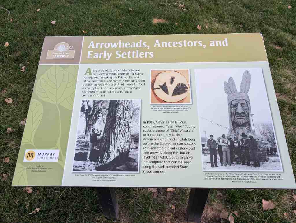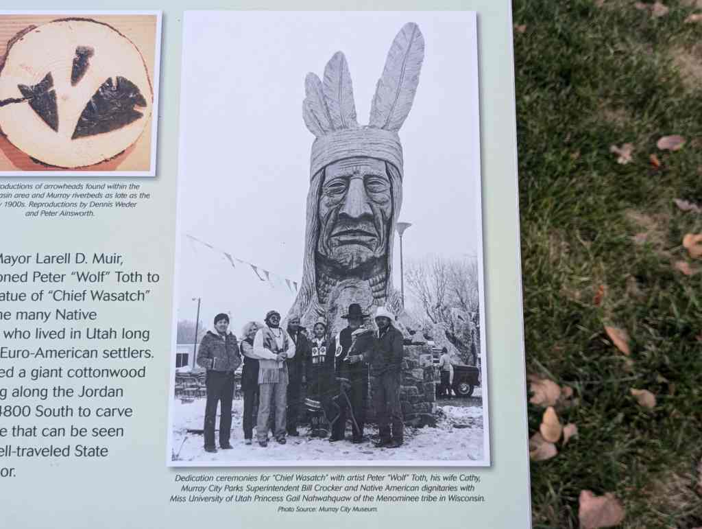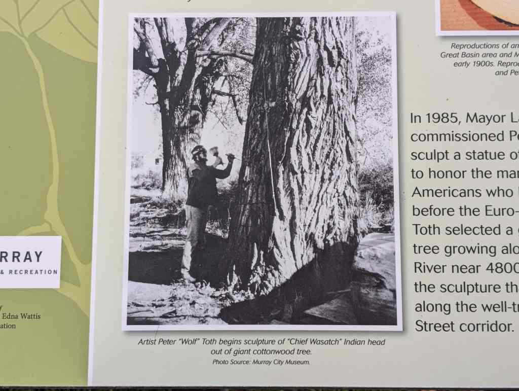 In 1985, Mayor Larell D. Muir, commissioned Peter “Wolf” Toth to sculpt a statue of “Chief Wasatch” to honor the many Native Americans who lived in Utah long before the Euro-American settlers. Toth selected a giant cottonwood tree growing along the Jordan River near 4800 South to carve the sculpture that can be seen along the well-traveled State Street corridor.
