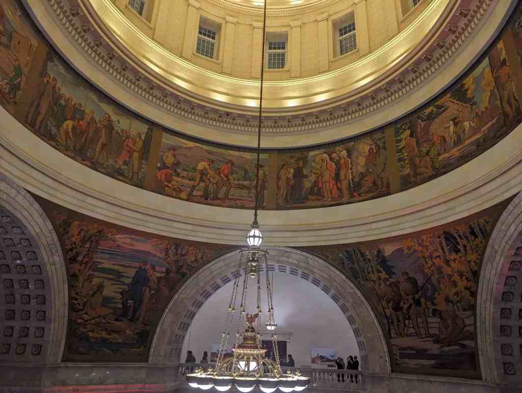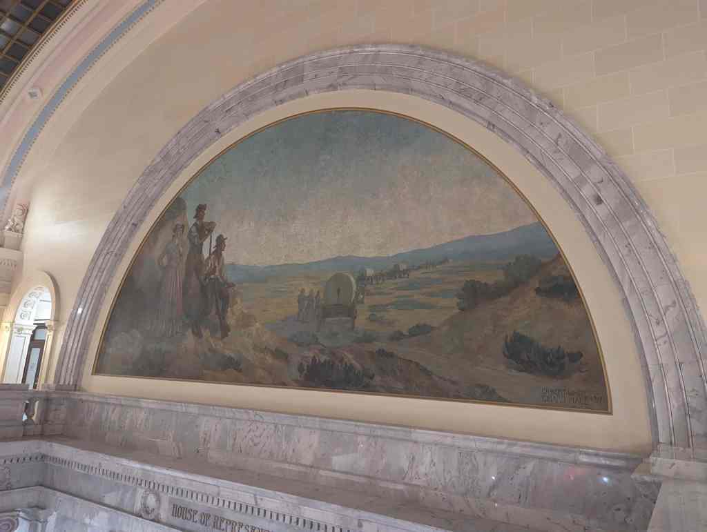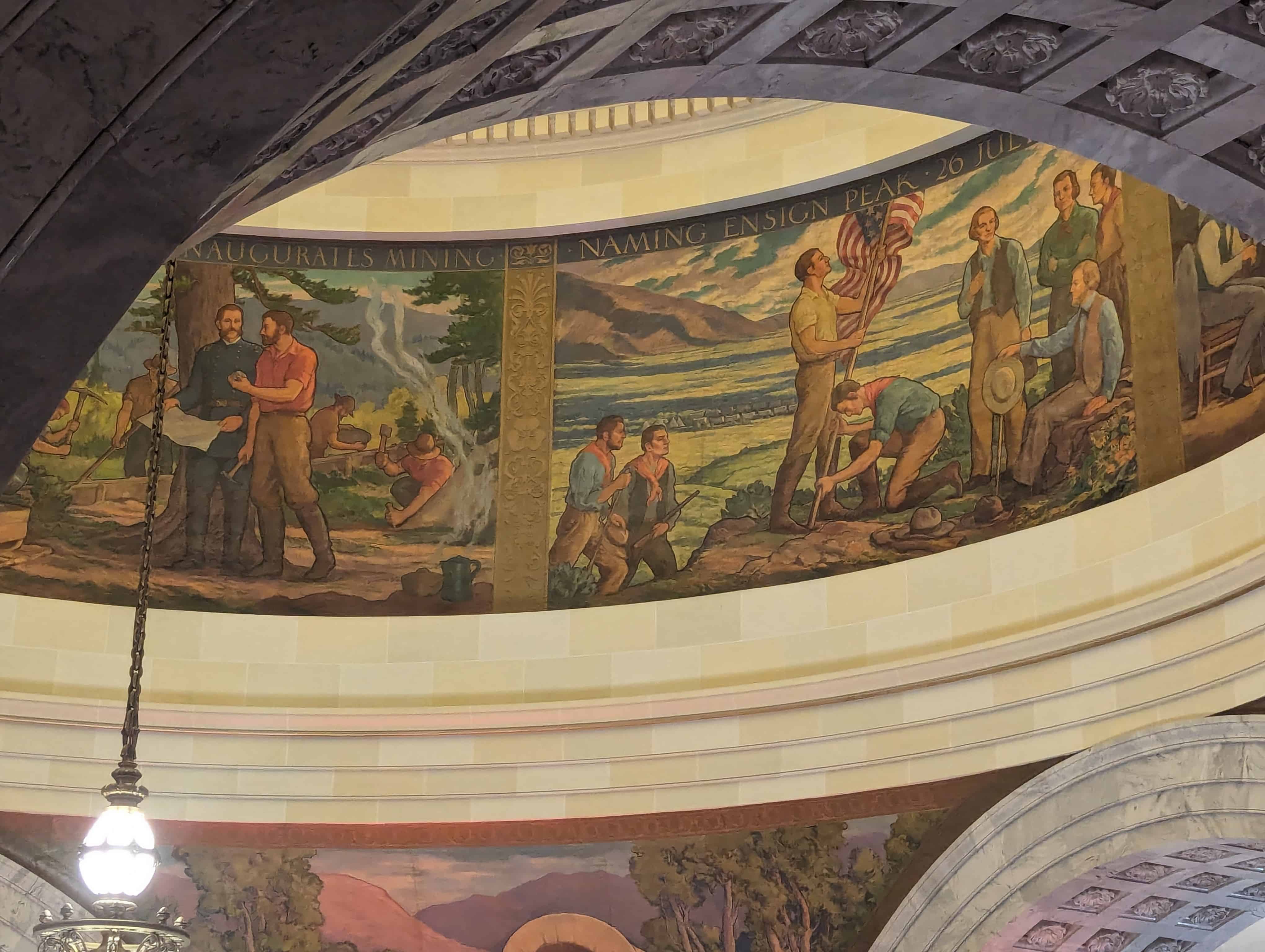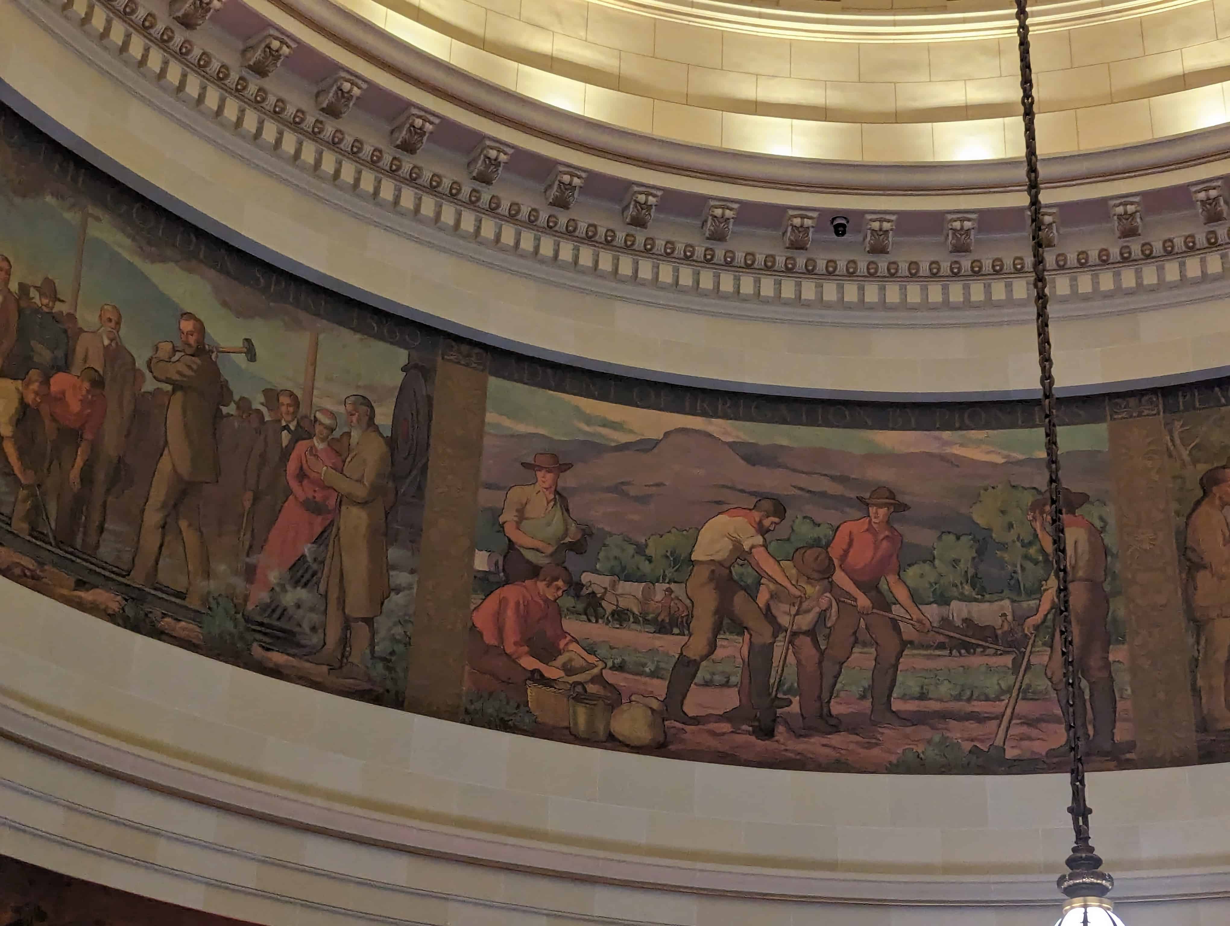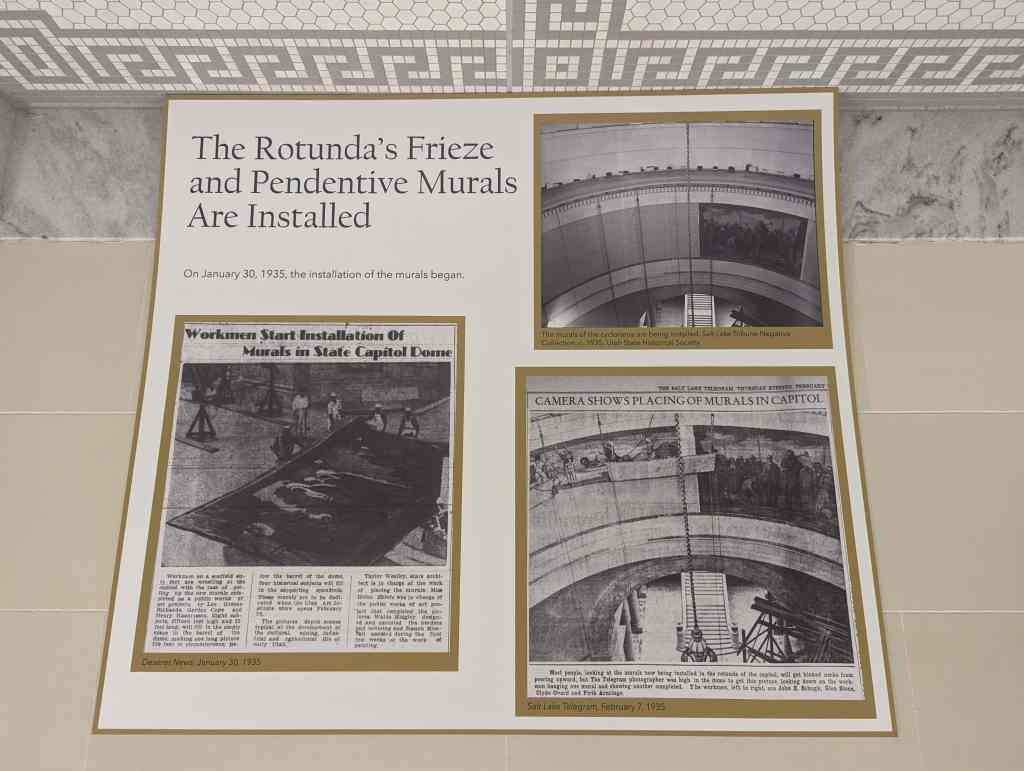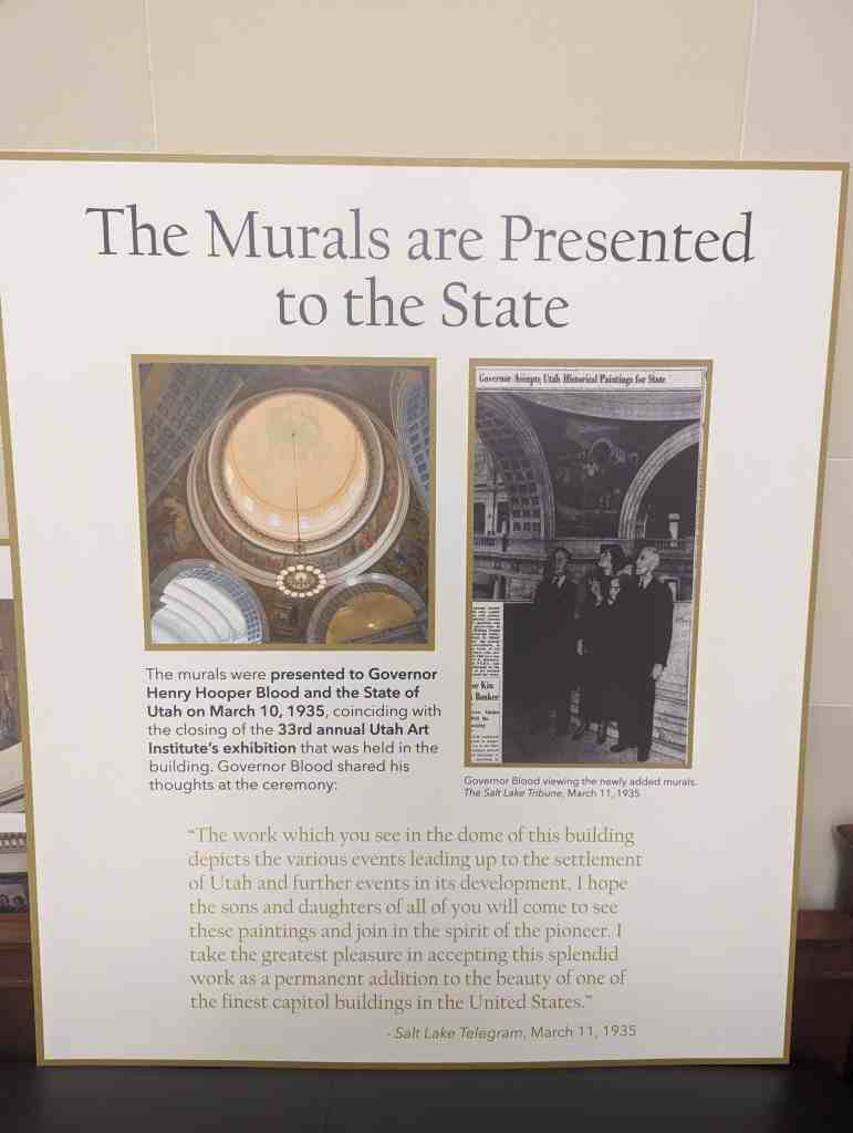 “The work which you see in the dome of this building depicts the various events leading up to the settlement of Utah and further events in its development. I hope the sons and daughters of all of you will come to see these paintings and join in the spirit of the pioneer. I take the greatest pleasure in accepting this splendid work as a permanent addition to the beauty of one of the finest capitol buildings in the United States.” – Salt Lake Telegram, March 11, 1935