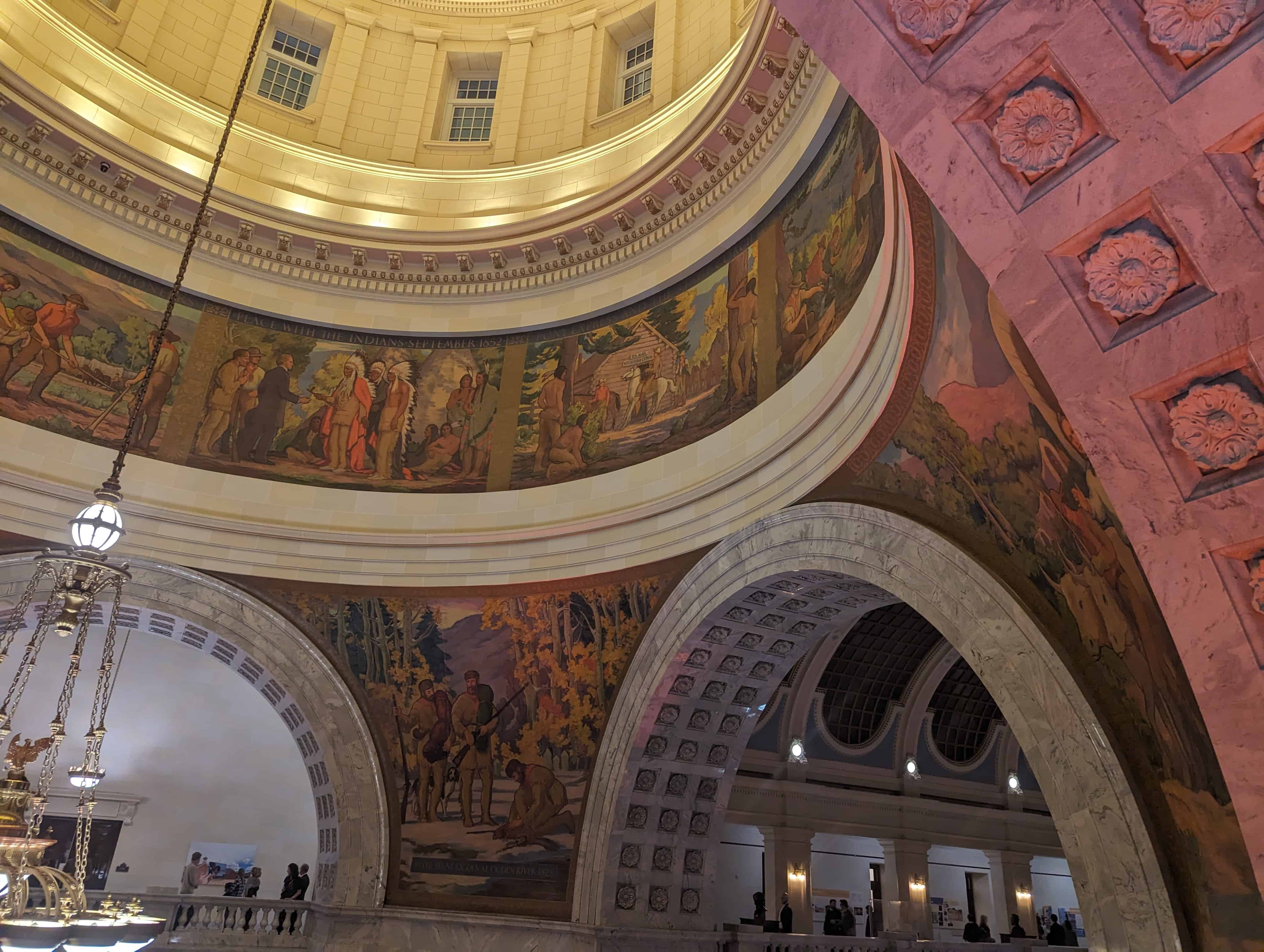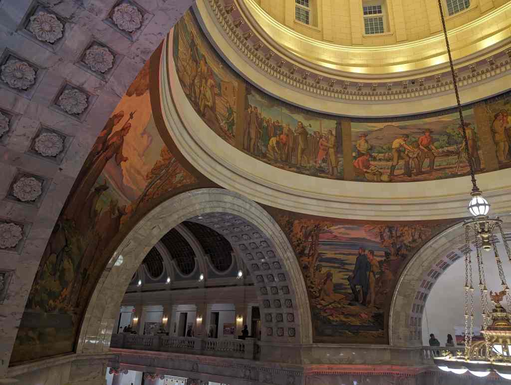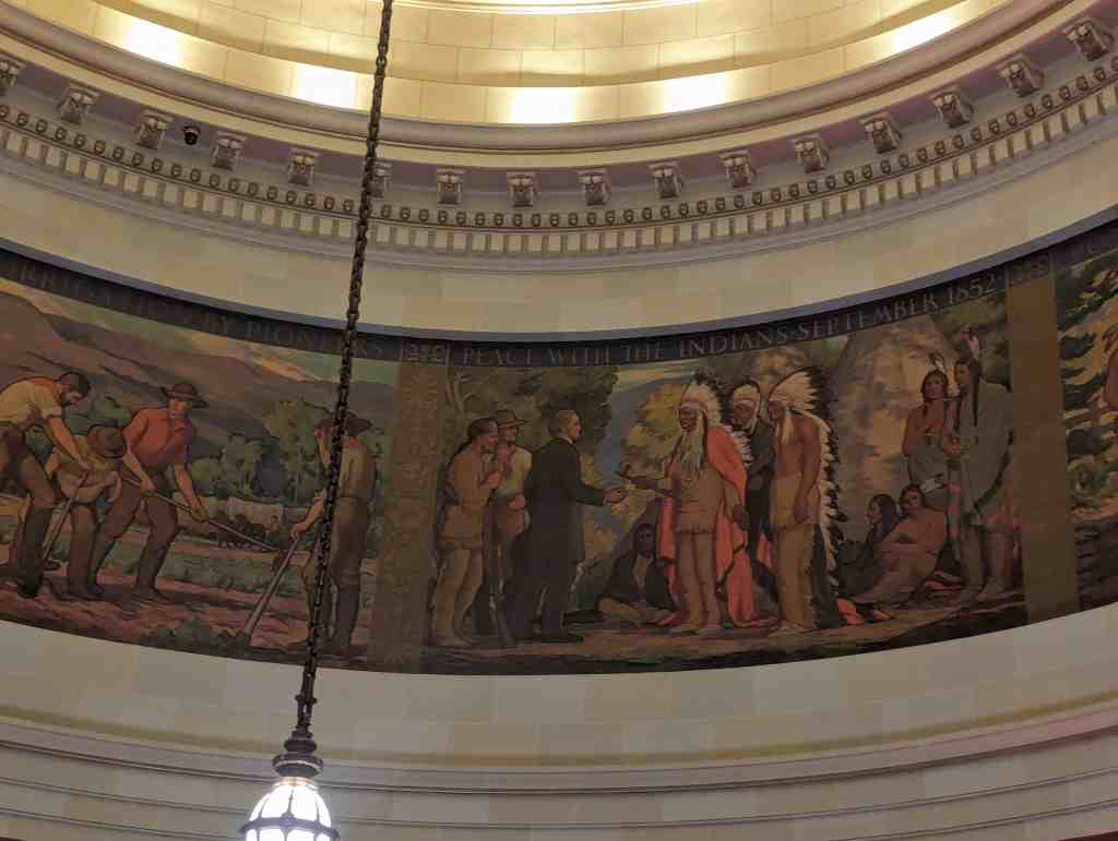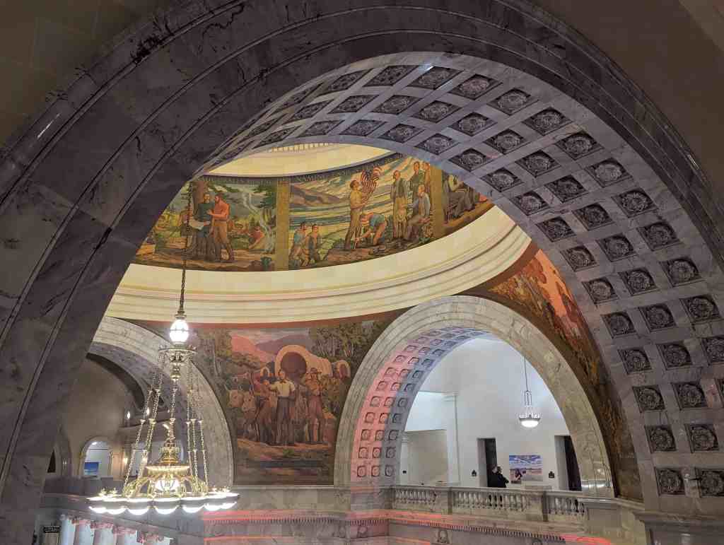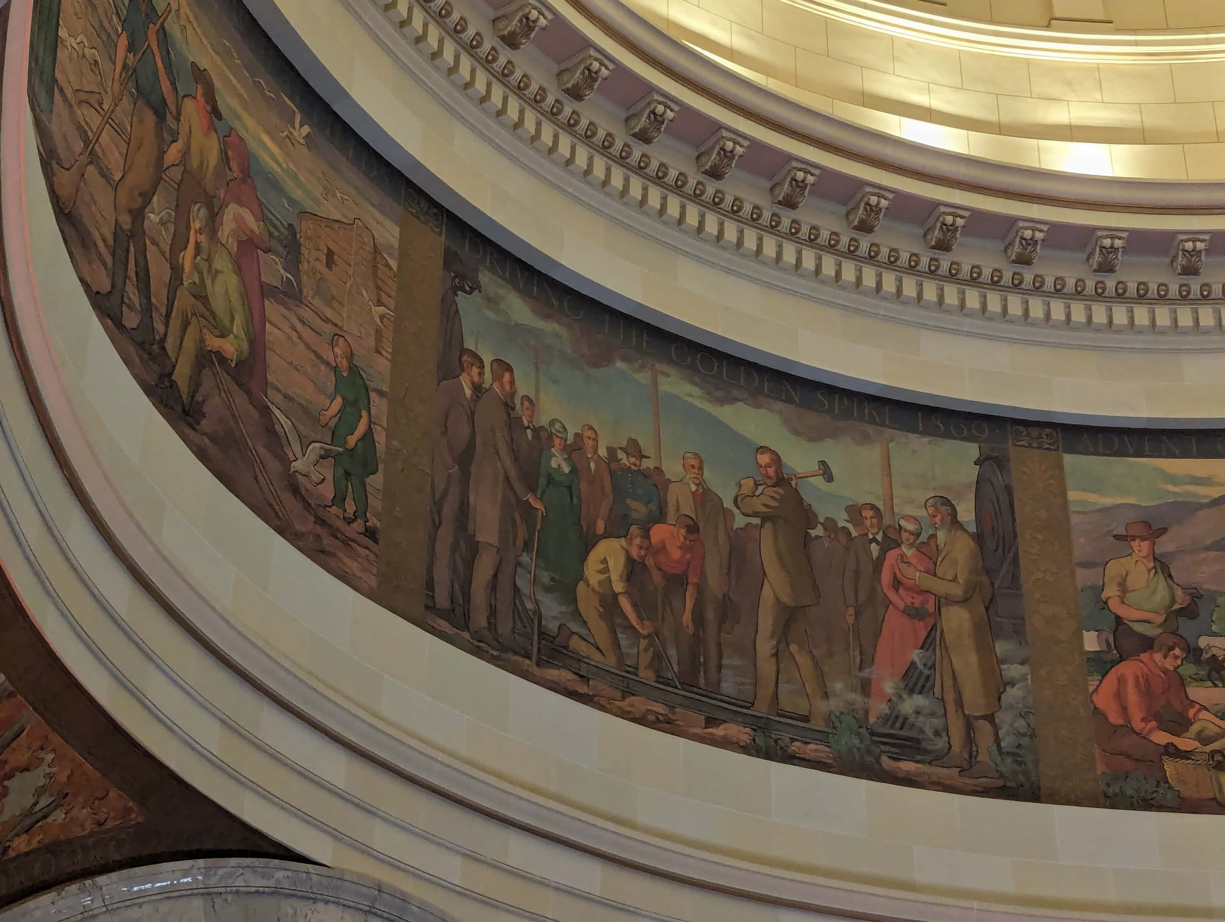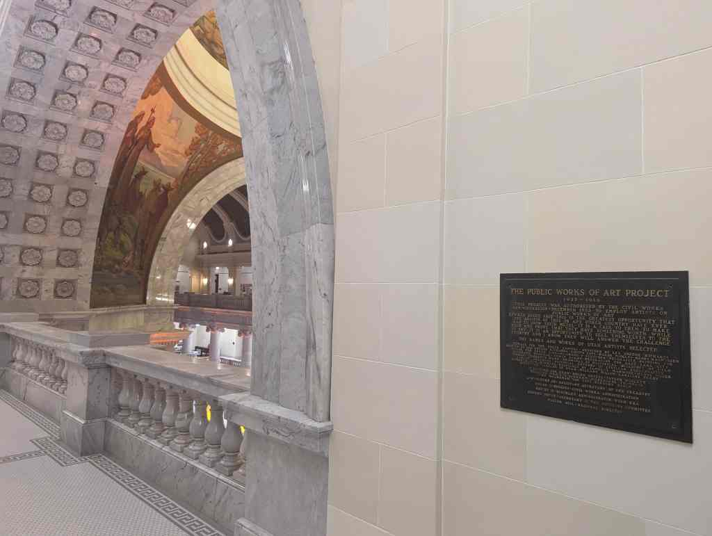 “The work which you see in the dome of this building depicts the various events leading up to the settlement of Utah and further events in its development. I hope the sons and daughters of all of you will come to see these paintings and join in the spirit of the pioneer. I take the greatest pleasure in accepting this splendid work as a permanent addition to the beauty of one of the finest capitol buildings in the United States.” – Salt Lake Telegram, March 11, 1935